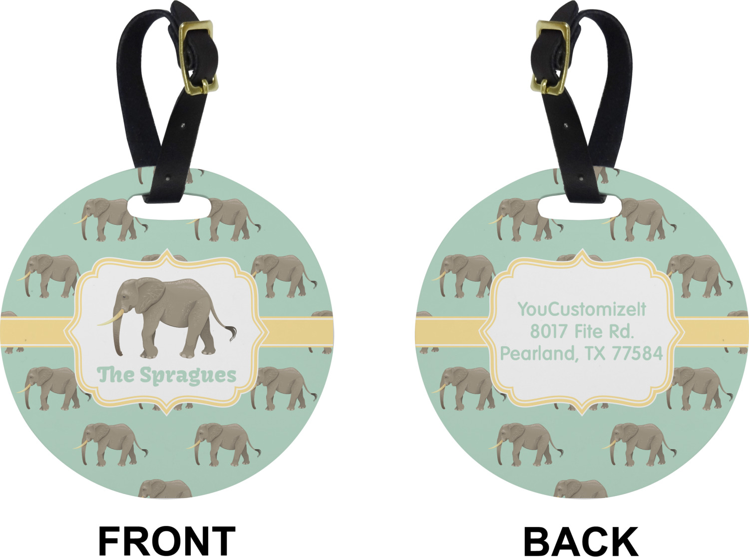 These personalized bag tags are sold in a variety of shapes, so that you may find the product that meets your vision exactly. We sell a round luggage tag, which measures at approximately 4" x 4". Our square luggage tag is about 3.5" x 3.5", while our rectangular version is 2.75" x 4 ".
