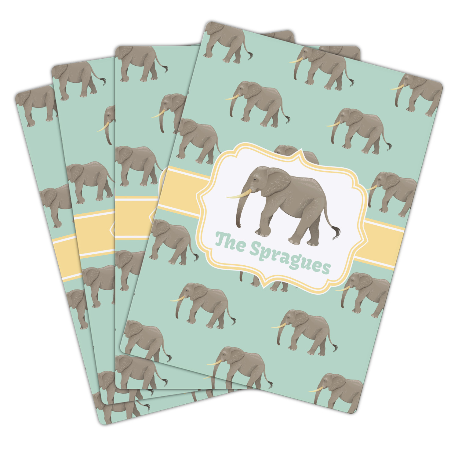 An elephant never forgets, and we hope you won't forget this Elephant design. The design shows gray, tusked elephants on a mint background with a light yellow ribbons. The center has a label with an elephant and a space for text.