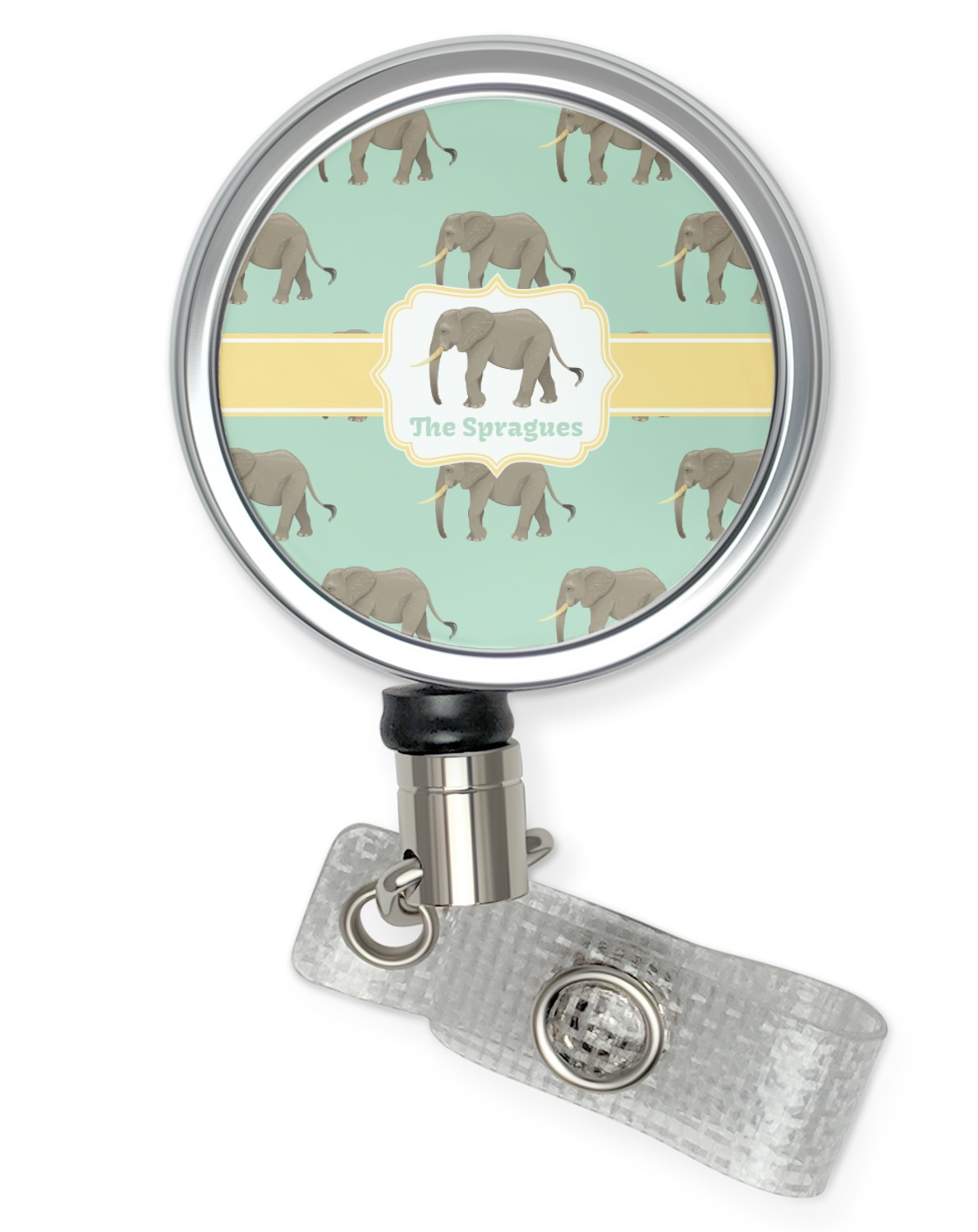 An elephant never forgets, and we hope you won't forget this Elephant design. The design shows gray, tusked elephants on a mint background with a light yellow ribbons. The center has a label with an elephant and a space for text.