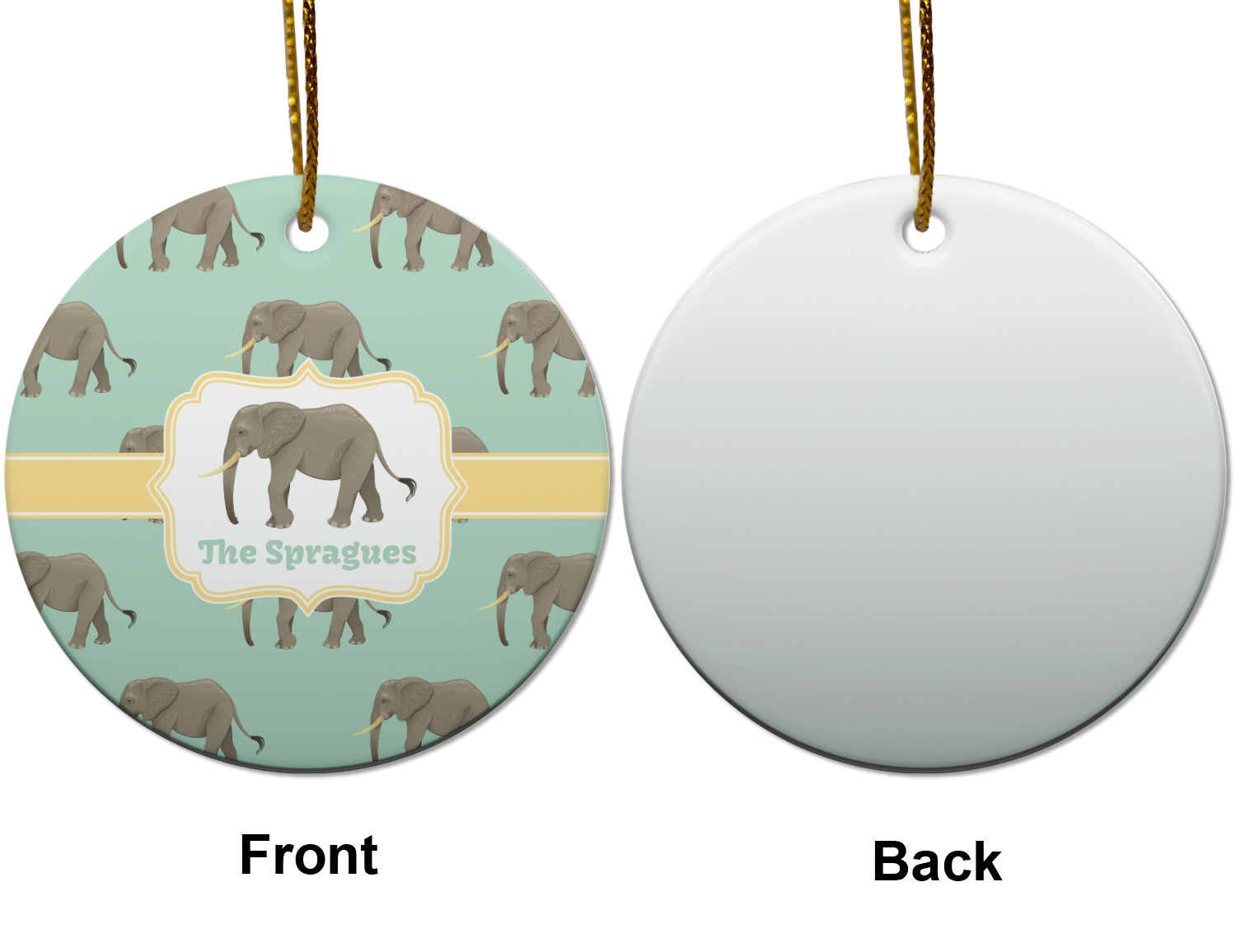 An elephant never forgets, and we hope you won't forget this Elephant design. The design shows gray, tusked elephants on a mint background with a light yellow ribbons. The center has a label with an elephant and a space for text.
