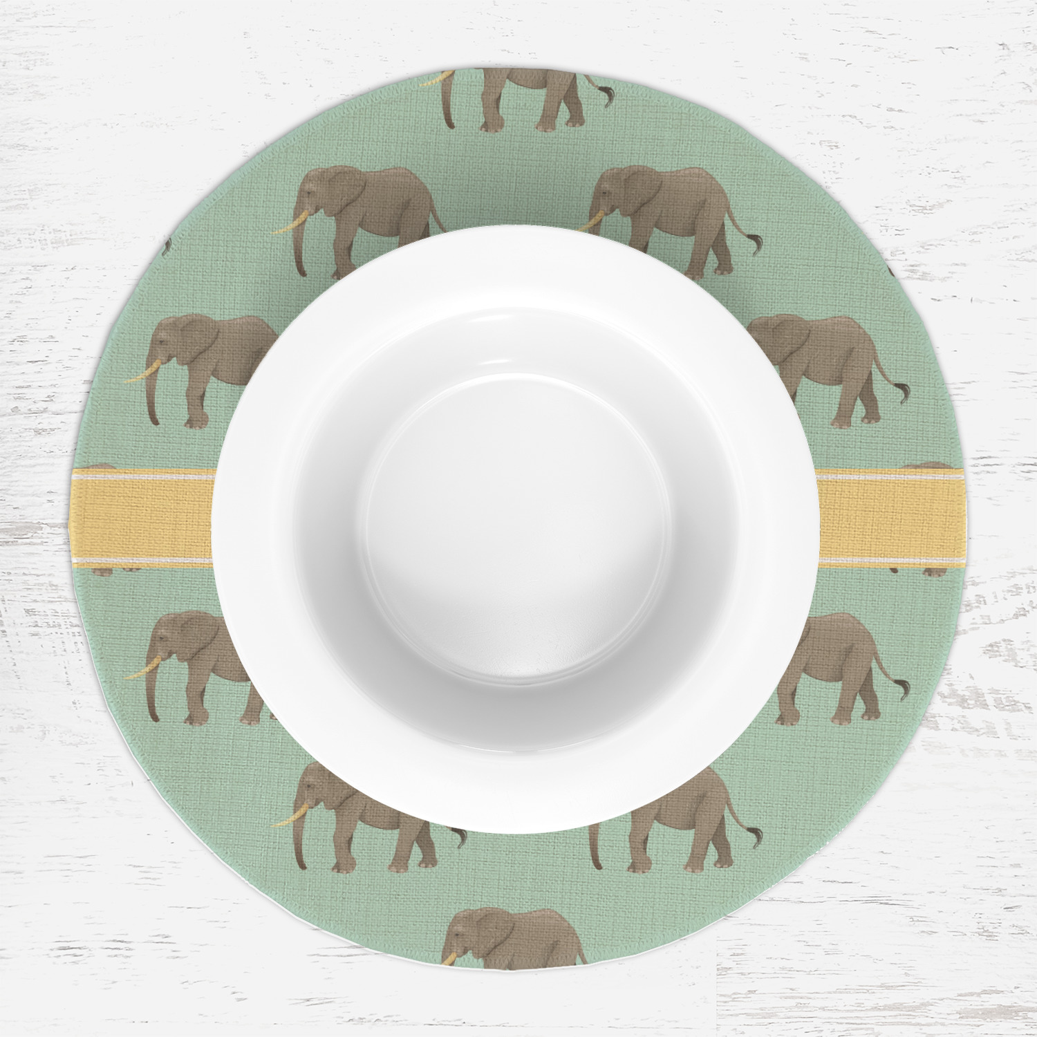 An elephant never forgets, and we hope you won't forget this Elephant design. The design shows gray, tusked elephants on a mint background with a light yellow ribbons. The center has a label with an elephant and a space for text.