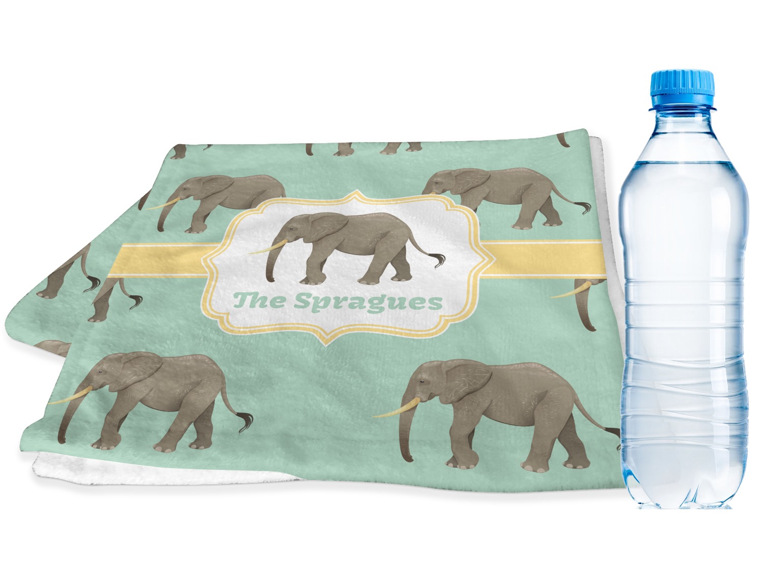 An elephant never forgets, and we hope you won't forget this Elephant design. The design shows gray, tusked elephants on a mint background with a light yellow ribbons. The center has a label with an elephant and a space for text.