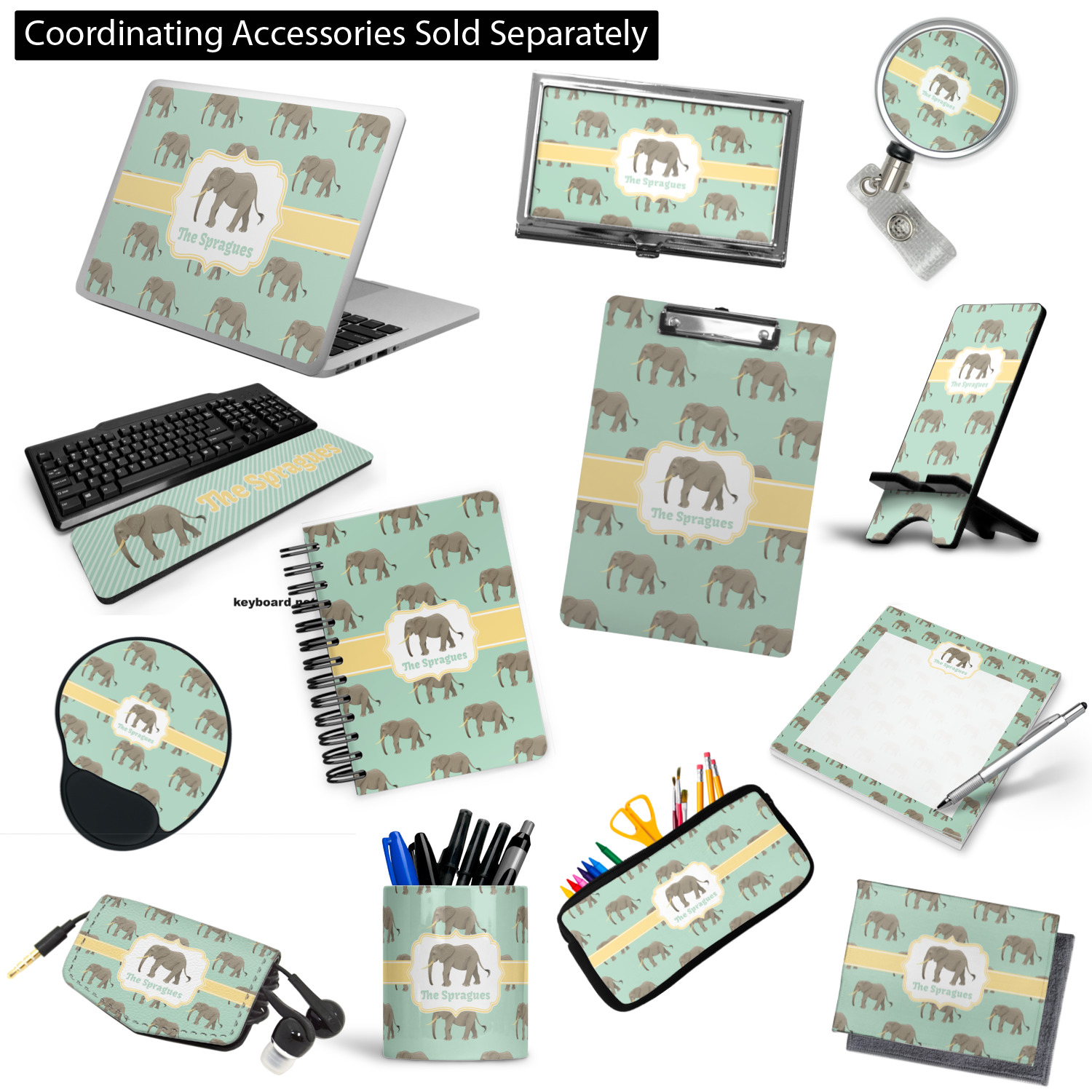 An elephant never forgets, and we hope you won't forget this Elephant design. The design shows gray, tusked elephants on a mint background with a light yellow ribbons. The center has a label with an elephant and a space for text.