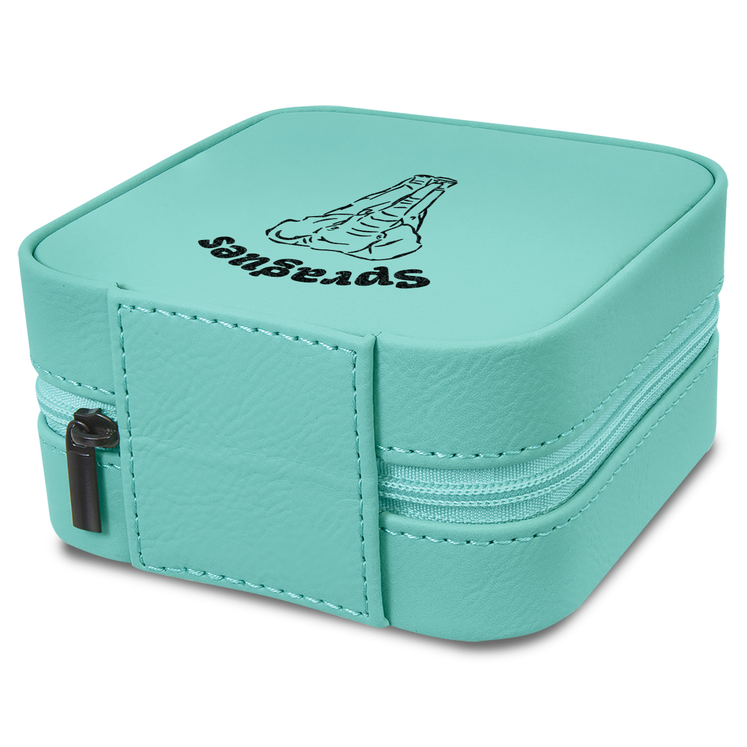 This square zippered travel jewelry box is made from leatherette and is available in four colors - classic cognac / rawhide, a beautiful teal. navy blue or pink. The tan colored soft velvet inside has compartments and hooks for all your jewelry - rings, chains, earrings, bangles etc.