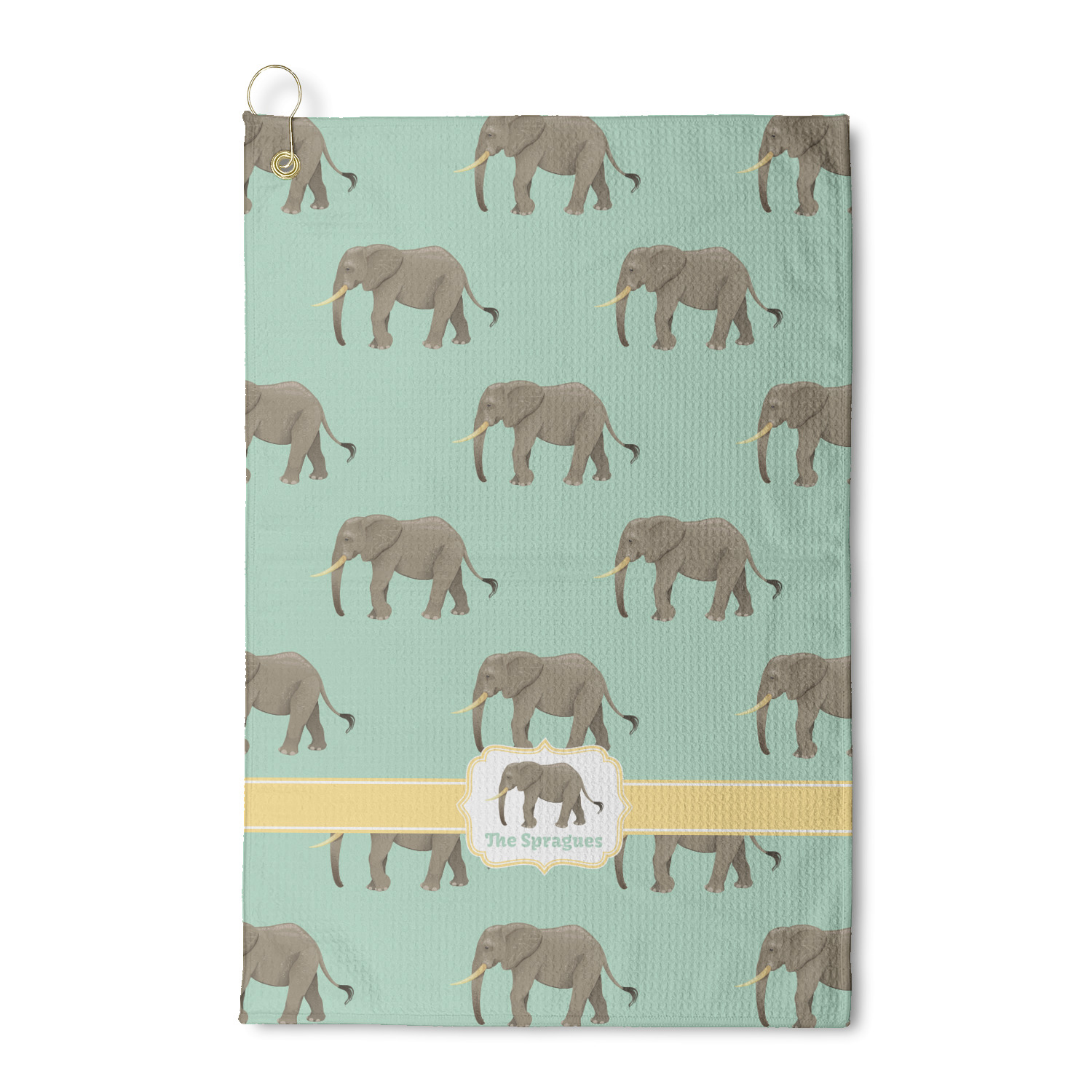 An elephant never forgets, and we hope you won't forget this Elephant design. The design shows gray, tusked elephants on a mint background with a light yellow ribbons. The center has a label with an elephant and a space for text.