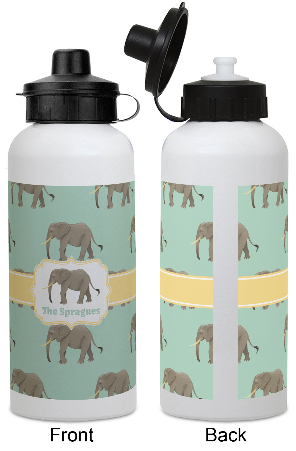 An elephant never forgets, and we hope you won't forget this Elephant design. The design shows gray, tusked elephants on a mint background with a light yellow ribbons. The center has a label with an elephant and a space for text.