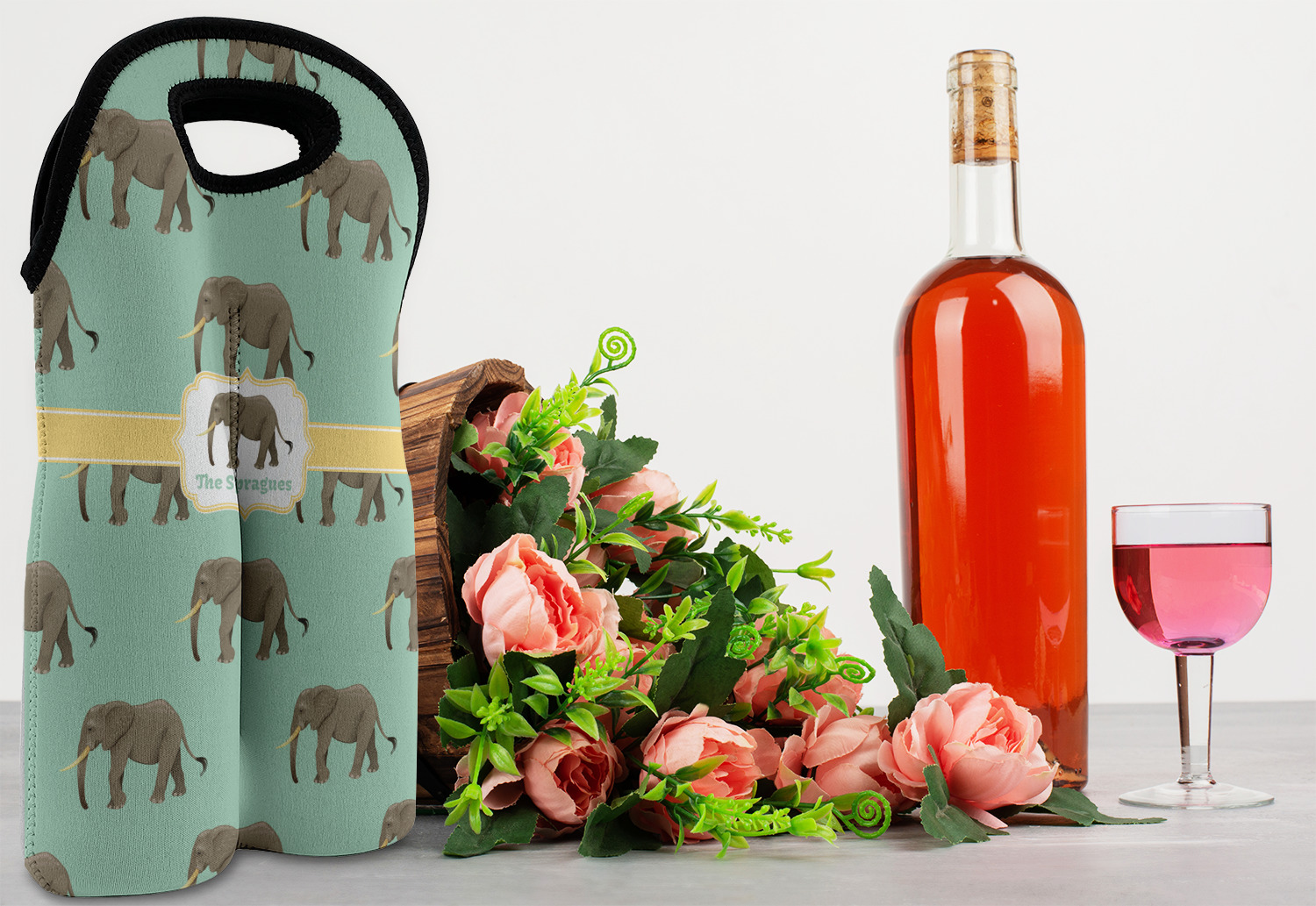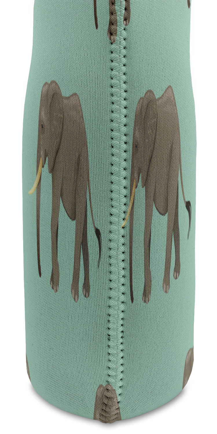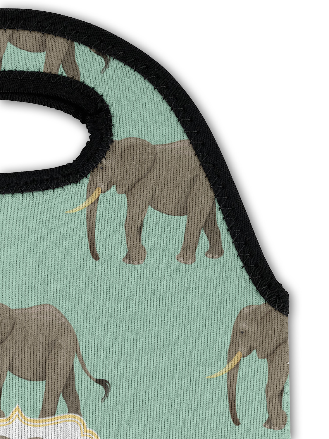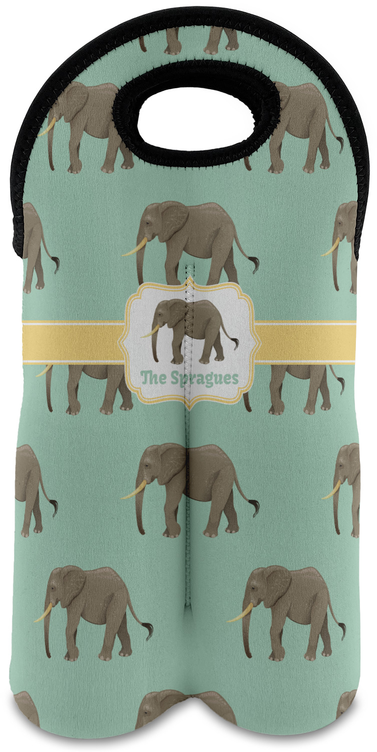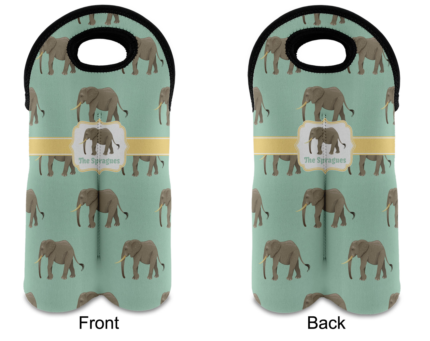 An elephant never forgets, and we hope you won't forget this Elephant design. The design shows gray, tusked elephants on a mint background with a light yellow ribbons. The center has a label with an elephant and a space for text.
