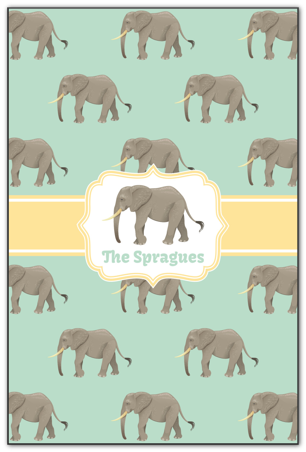 An elephant never forgets, and we hope you won't forget this Elephant design. The design shows gray, tusked elephants on a mint background with a light yellow ribbons. The center has a label with an elephant and a space for text.