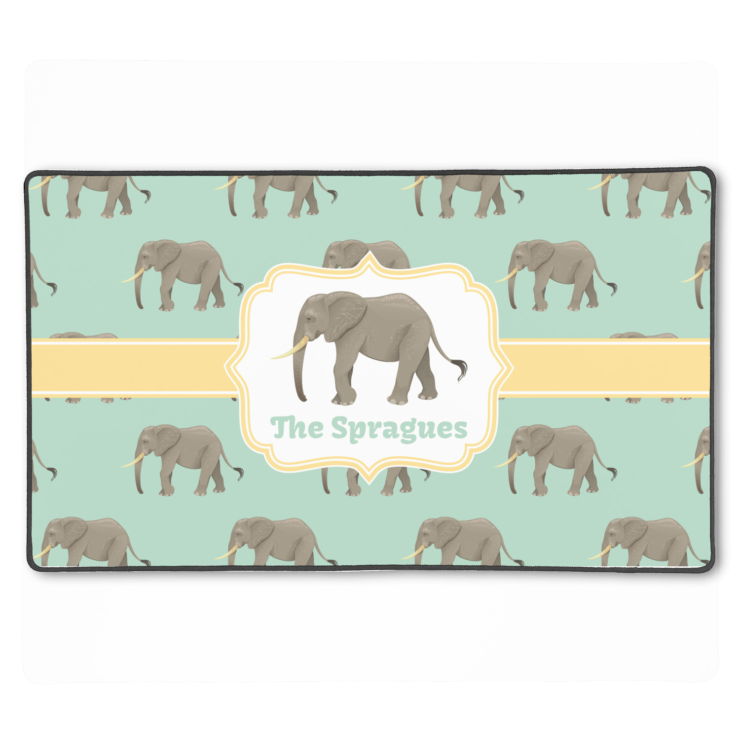 An elephant never forgets, and we hope you won't forget this Elephant design. The design shows gray, tusked elephants on a mint background with a light yellow ribbons. The center has a label with an elephant and a space for text.