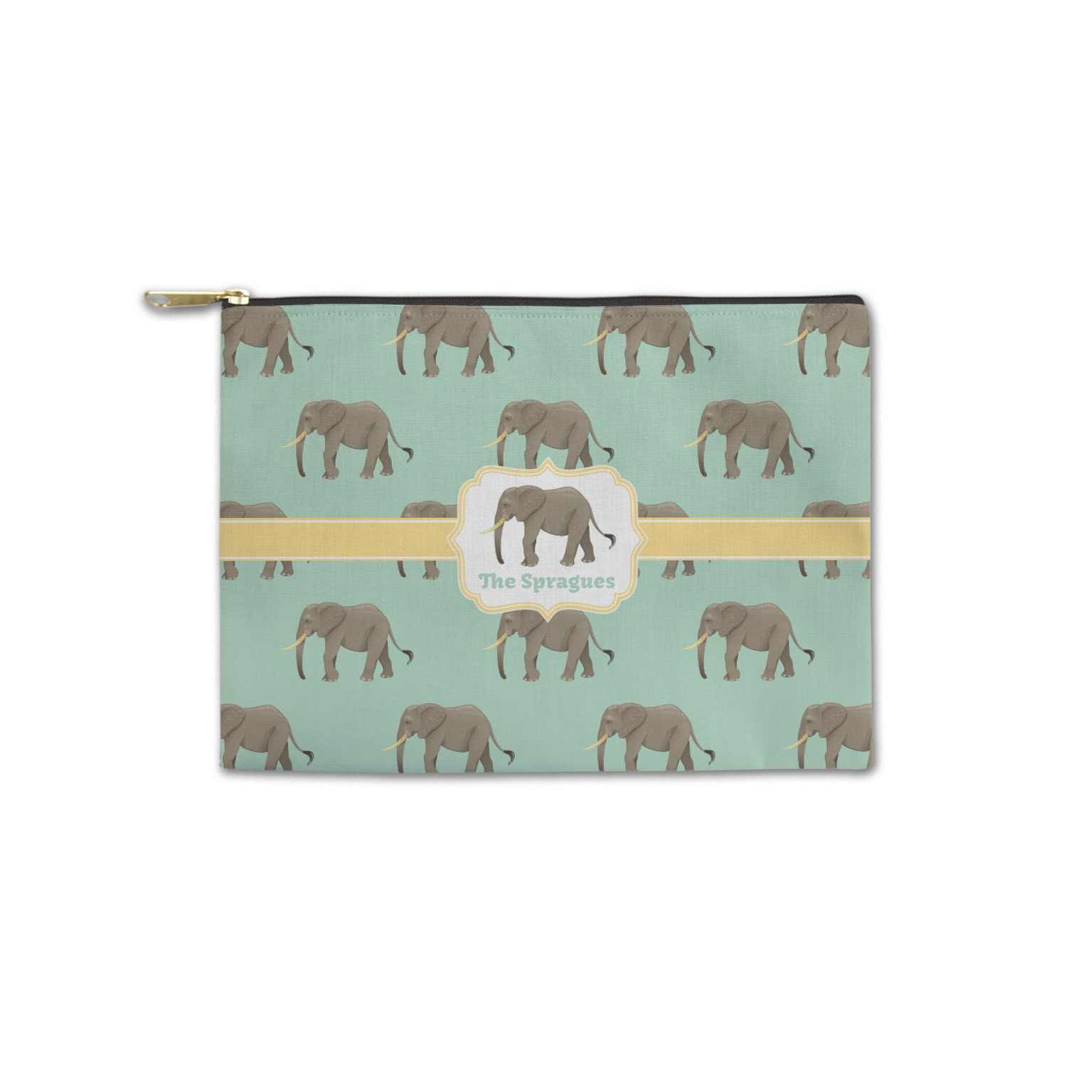Our zippered pouches are available in two sizes - small: approx 8.5W"x6H and large: approx 12.5Wx8.5H. The pouches are made from a soft & durable canvas fabric that is printed on the outside with your design; the inside has a fused black lining. The printed canvas fabric is then cut and the pouches are sewn right here in the USA. The zipper itself is gold in color and has a round hook.