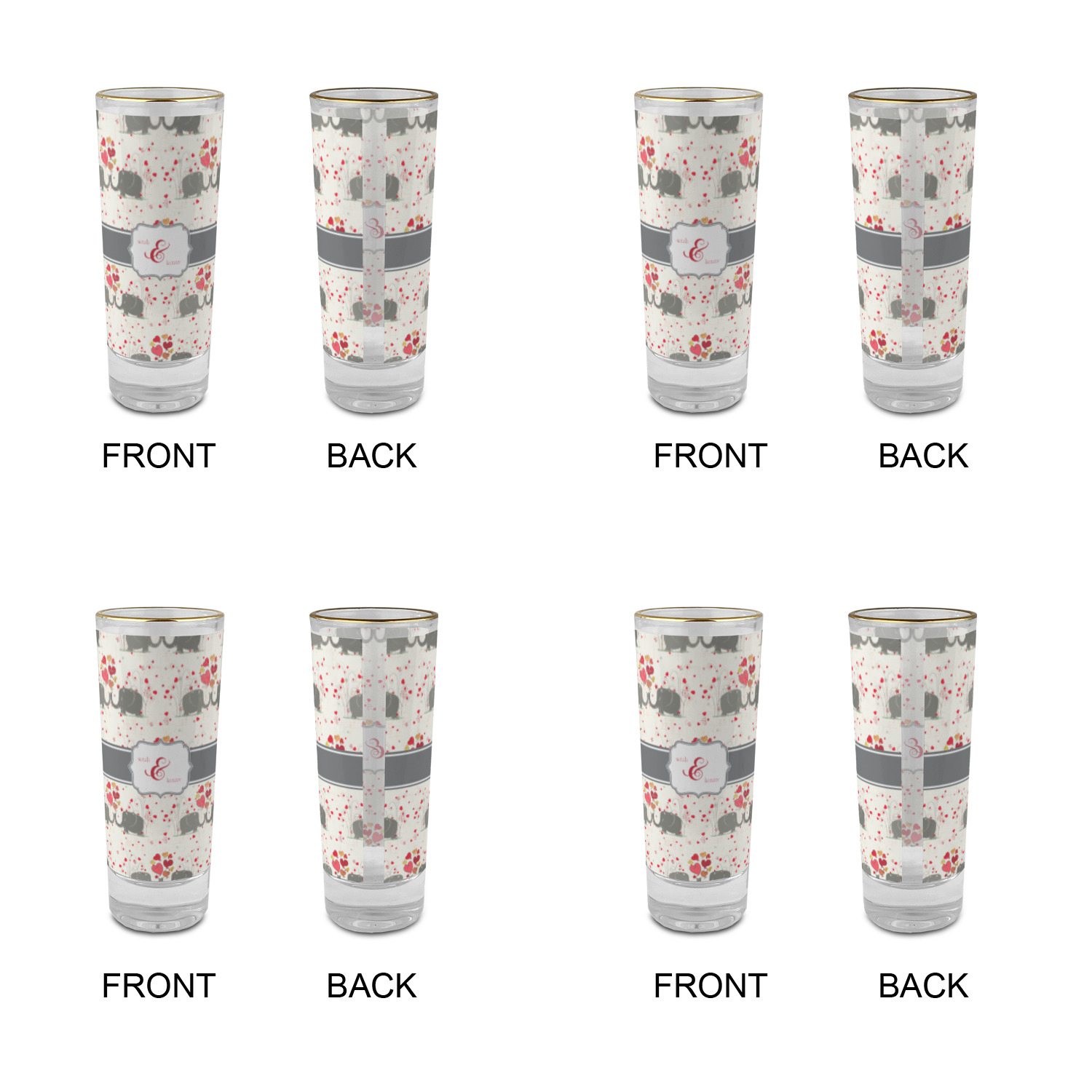 These glass shooter glasses are printed in full color with the design of your choice. These are a tall shooter 2 oz size and stand 4" tall. The print is a full wrap design to boldly display your personalization.