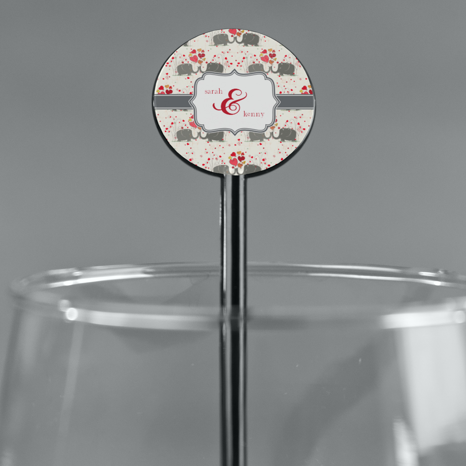 A demure gray ribbon matching the elephants' hides ties the whole design together. Add His&Her's names in the decorative label for that special touch.