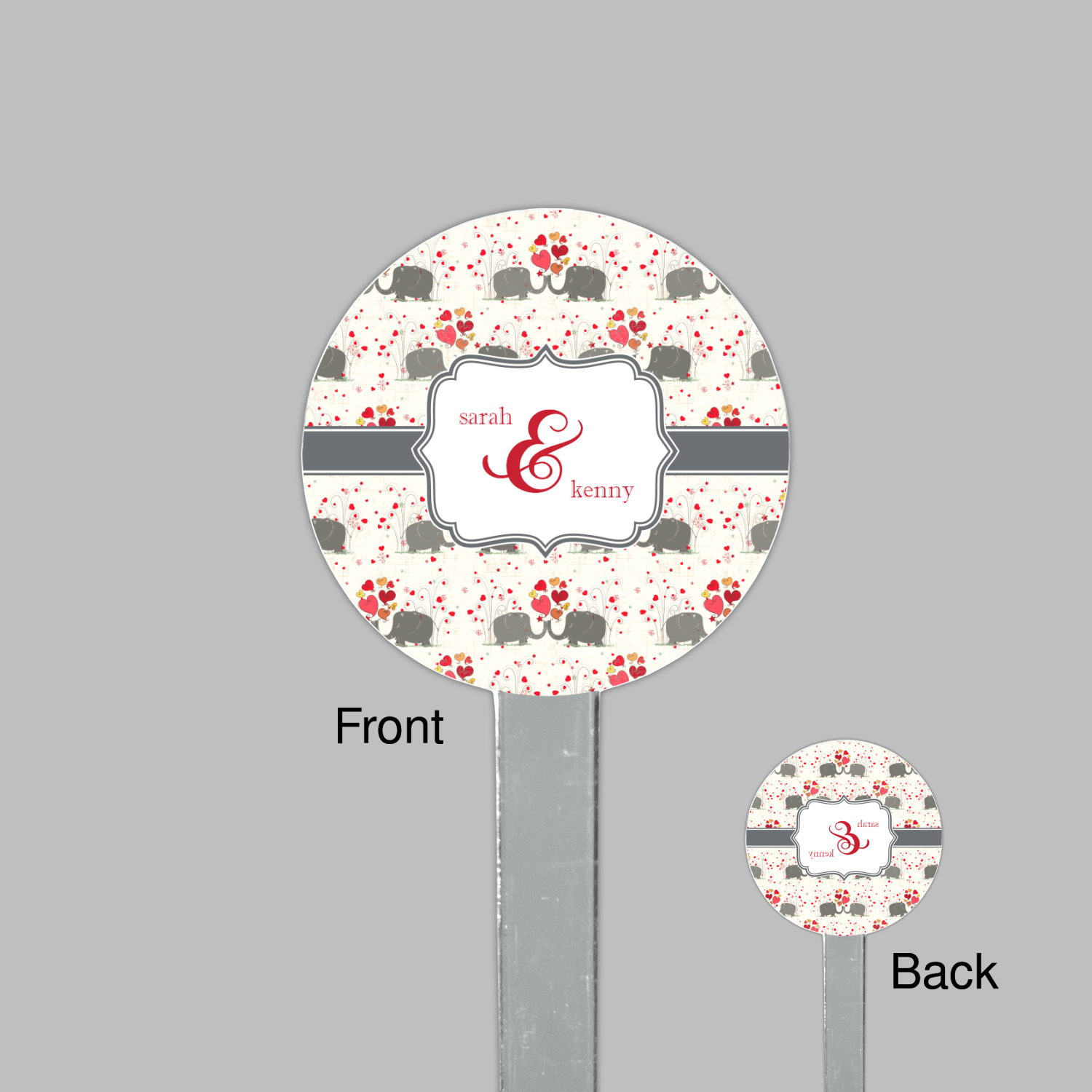 A demure gray ribbon matching the elephants' hides ties the whole design together. Add His&Her's names in the decorative label for that special touch.
