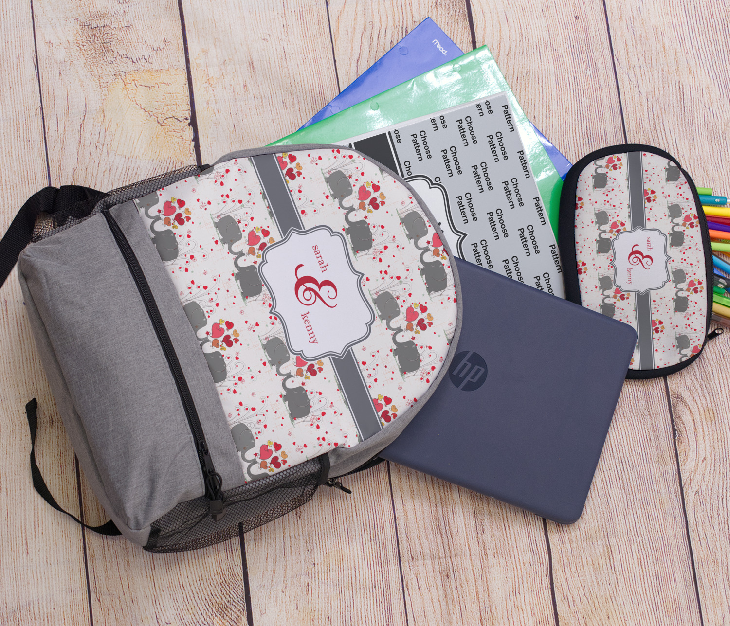 A demure gray ribbon matching the elephants' hides ties the whole design together. Add His&Her's names in the decorative label for that special touch.