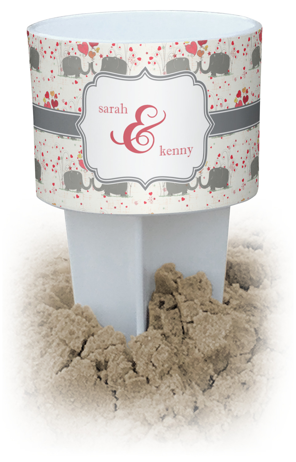 This cup holder has a large stake at its bottom that anchors it to the sand or ground below, while the cup holder rests above the stake. The entire drink holder is made of durable plastic and displays your customization around the cup holder portion. We sell these personalized beach spikers in two different colors: black and white.