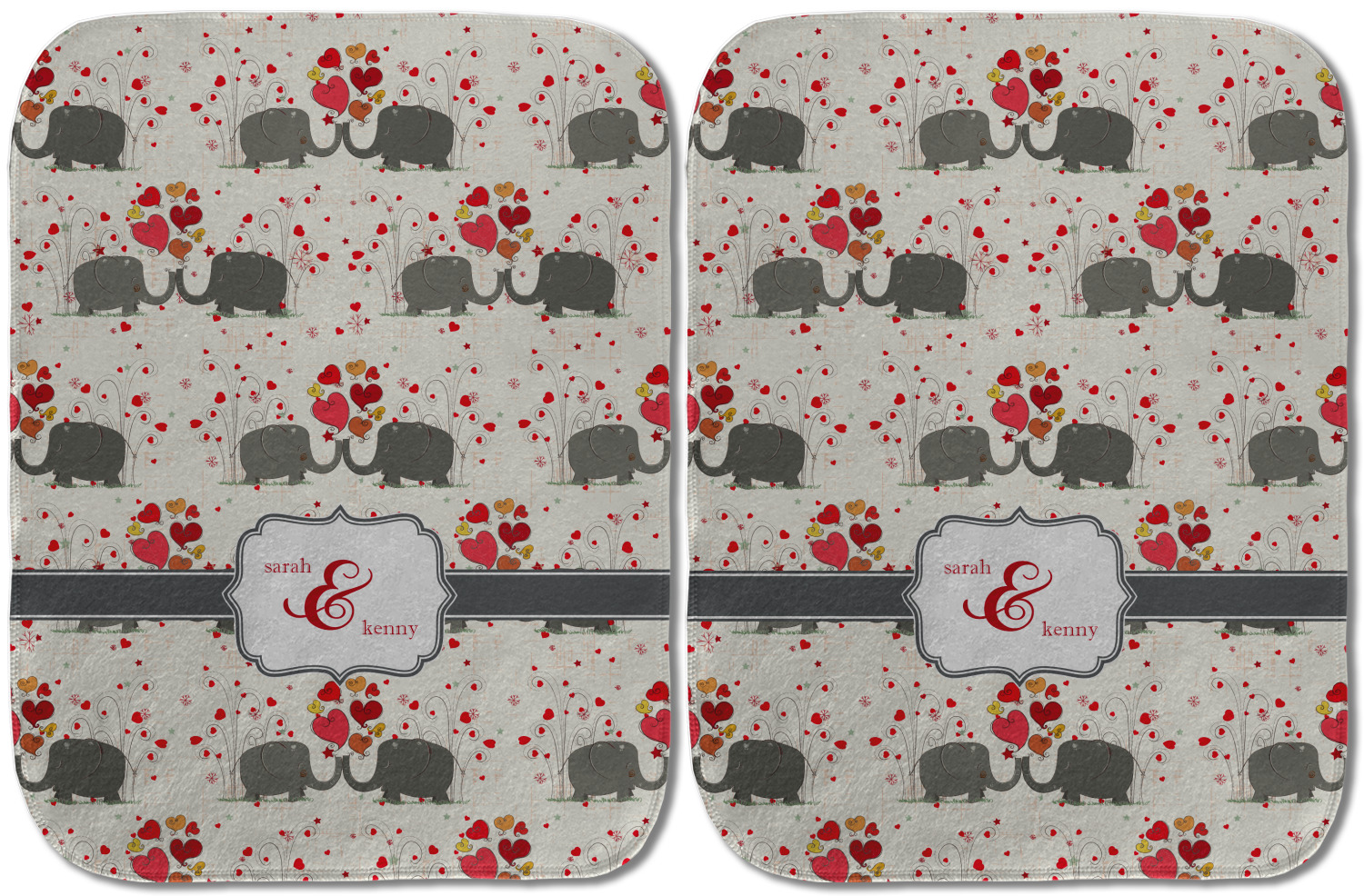 A demure gray ribbon matching the elephants' hides ties the whole design together. Add His&Her's names in the decorative label for that special touch.