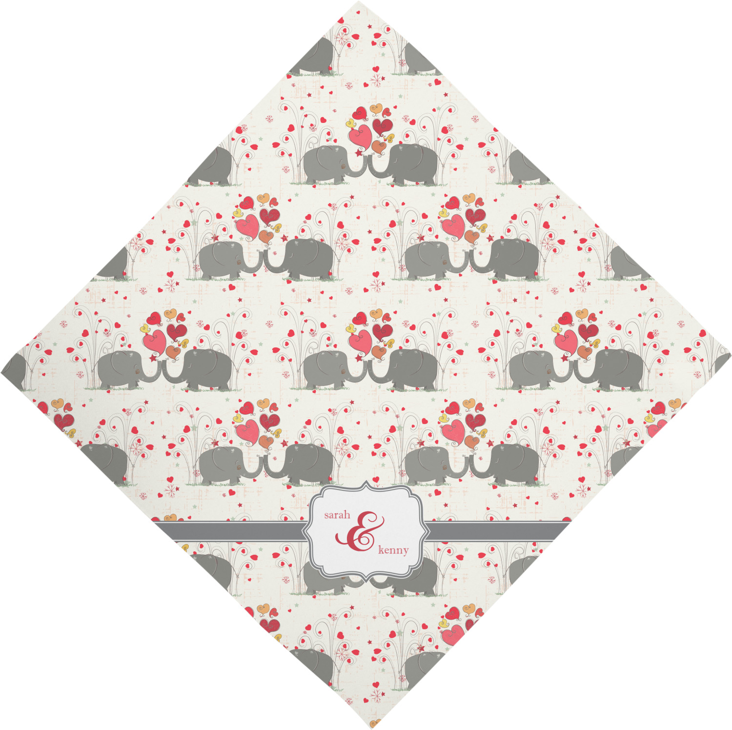 A demure gray ribbon matching the elephants' hides ties the whole design together. Add His&Her's names in the decorative label for that special touch.