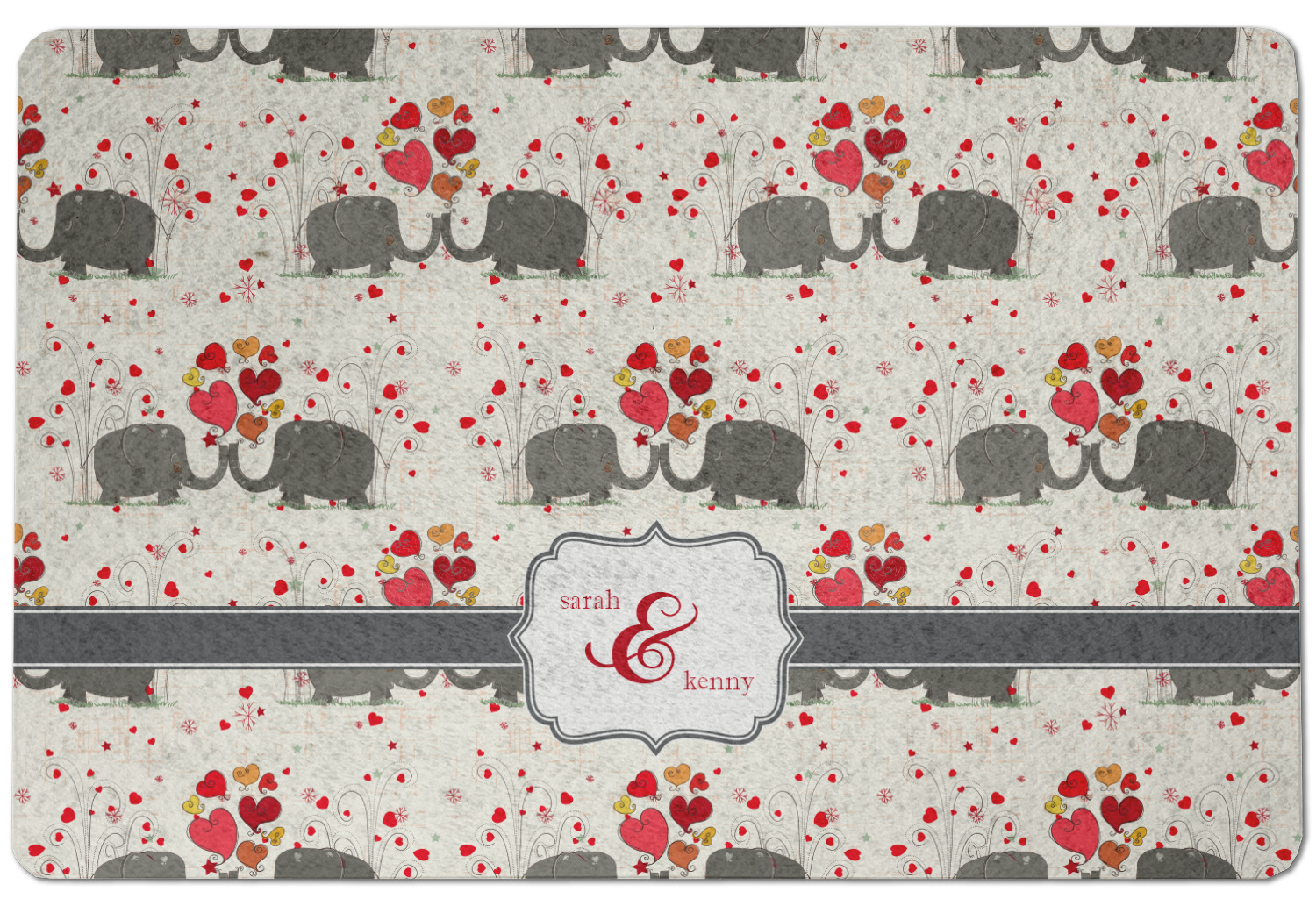 A demure gray ribbon matching the elephants' hides ties the whole design together. Add His&Her's names in the decorative label for that special touch.