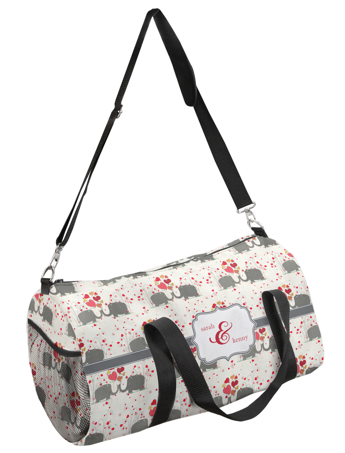This duffle is a sturdy bag made of a canvas material. It comes in two sizes: Small (19"W x 9.5"H x 9.5"D) and Large (23"W x 12"H x 12"D). The bag is a cylindrical shape with a black adjustable strap and two handles. On one side is an elastic pouch to put a waterbottle or other small item. Your product will be sublimated with your design and is able to be designed on the front, back, and sides. Be sure to remember that the straps may cut into parts of your design if you upload your own artwork.
