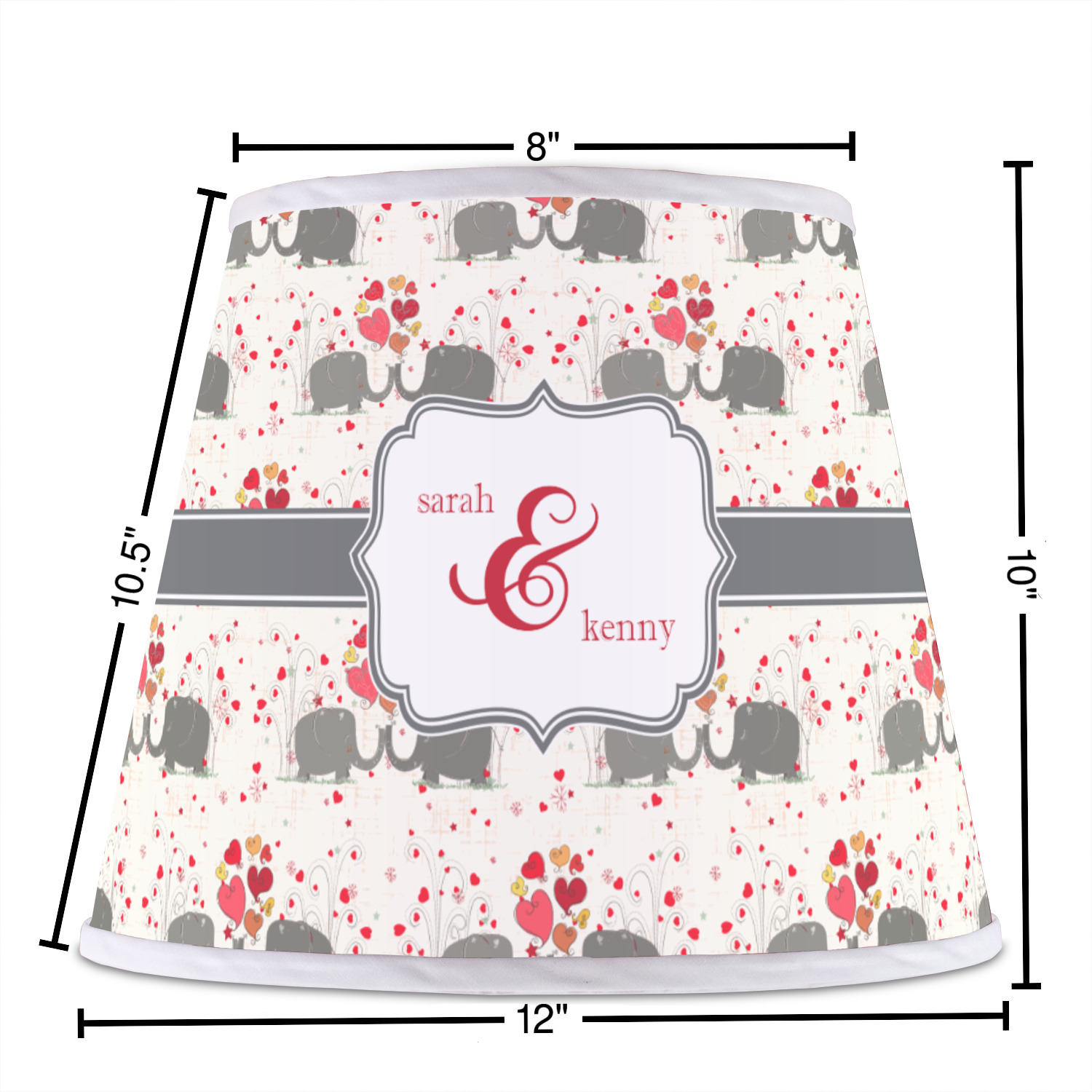 The base of this lampshade is 12 inches in diameter, and the top spans 8 inches in diameter. The total height of the lampshade is 10 inches. The angled nature of this custom lampshade concentrates the light, making it ideal for smaller spaces. This lampshade is made of matte, polyfilm, and displays your customization in its middle. The top and bottom of this colorful lamp shade are lined with a white fabric ribbon (which can be replaced with black inside the design studio) which frames your design and creates a sophisticated finish. As an UNO fitter lampshade, this unique lamp shade will fit a variety of bases.
