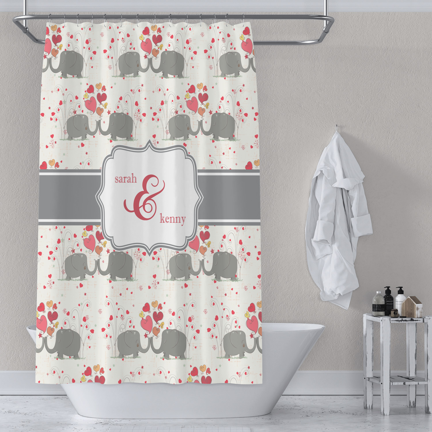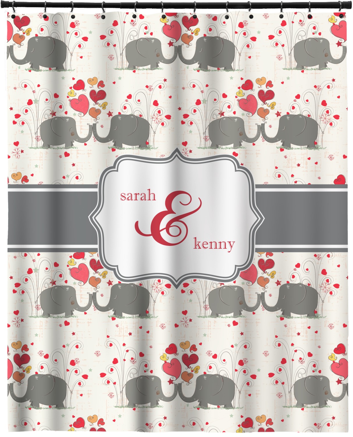 A demure gray ribbon matching the elephants' hides ties the whole design together. Add His&Her's names in the decorative label for that special touch.