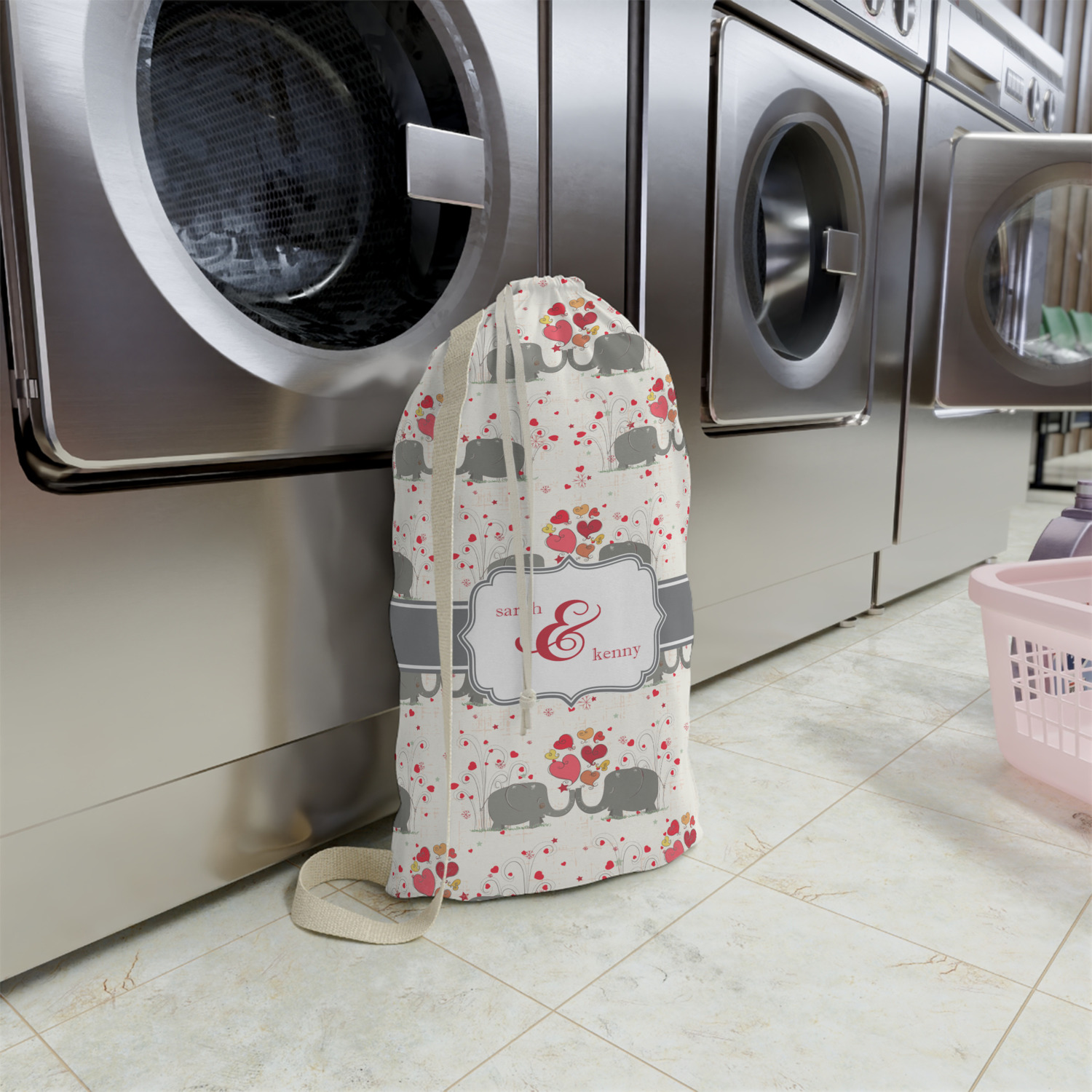 Carry your laundry in style with these customized laundry bags. Available in two sizes, featuring a natural colored woven strap and a cinch cord, these bags hold a lot of clothes or anything else you want to fit in them.