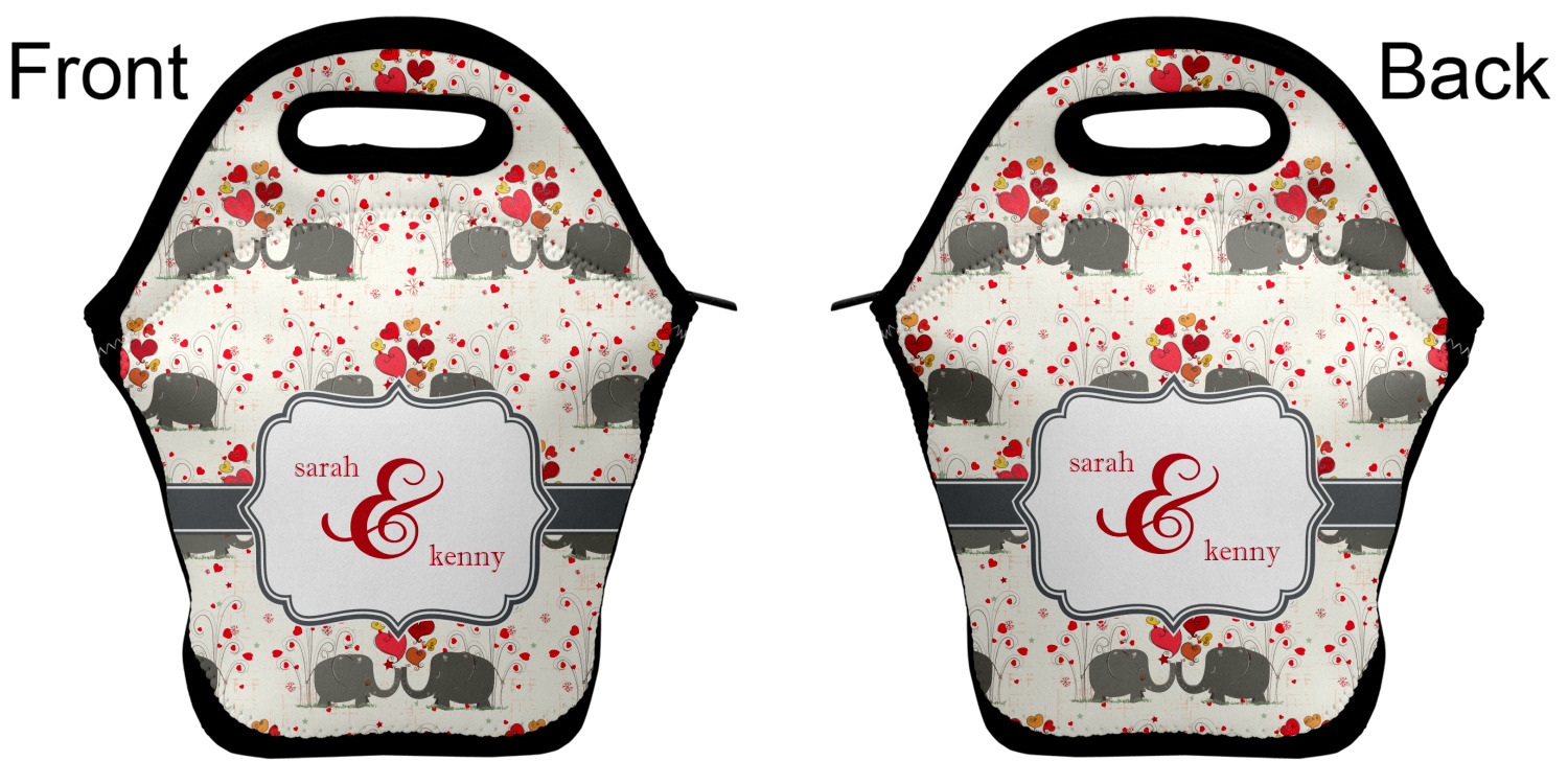 Our personalized lunch bags are made from a strong neoprene, and secure with a zipper closure that lines the top of the bag.The edges of the neoprene are sewn together with a heavy duty stitch, adding to the durability of the bag. The is accompanied by a reinforced handle at its top, for the easy transport of your lunch. We display your personalization across both the front and back of this neoprene lunch bag, while the remaining sides are a sleek black in color. Each bag measures at 13.5 inches tall, and 11.5 inches wide.