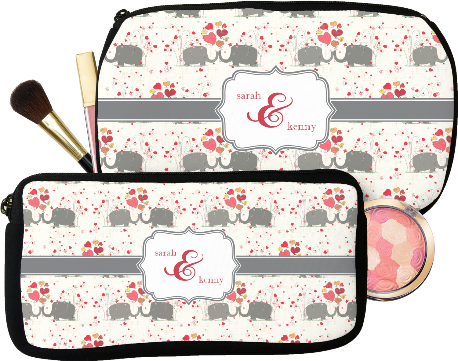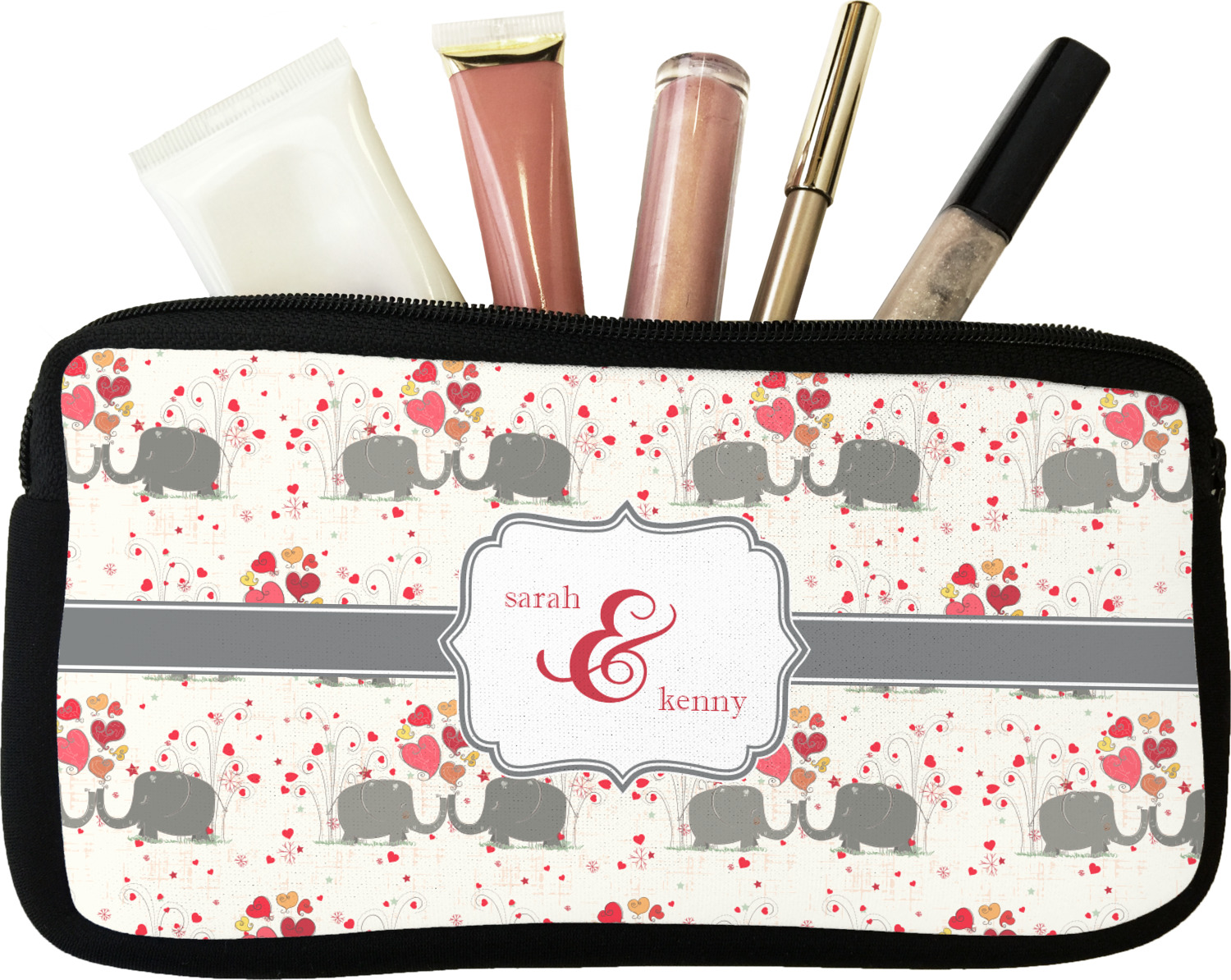 Our personalized makeup bags are available in many different designs, patterns and colors - so you are sure to find one that will love. They are made of neoprene (same material as wet-suits) and thus are water resistant, so spillages in your makeup bag will not end up all over you purse. They are customized on one side and are black on the other side and the zipper is black as well.