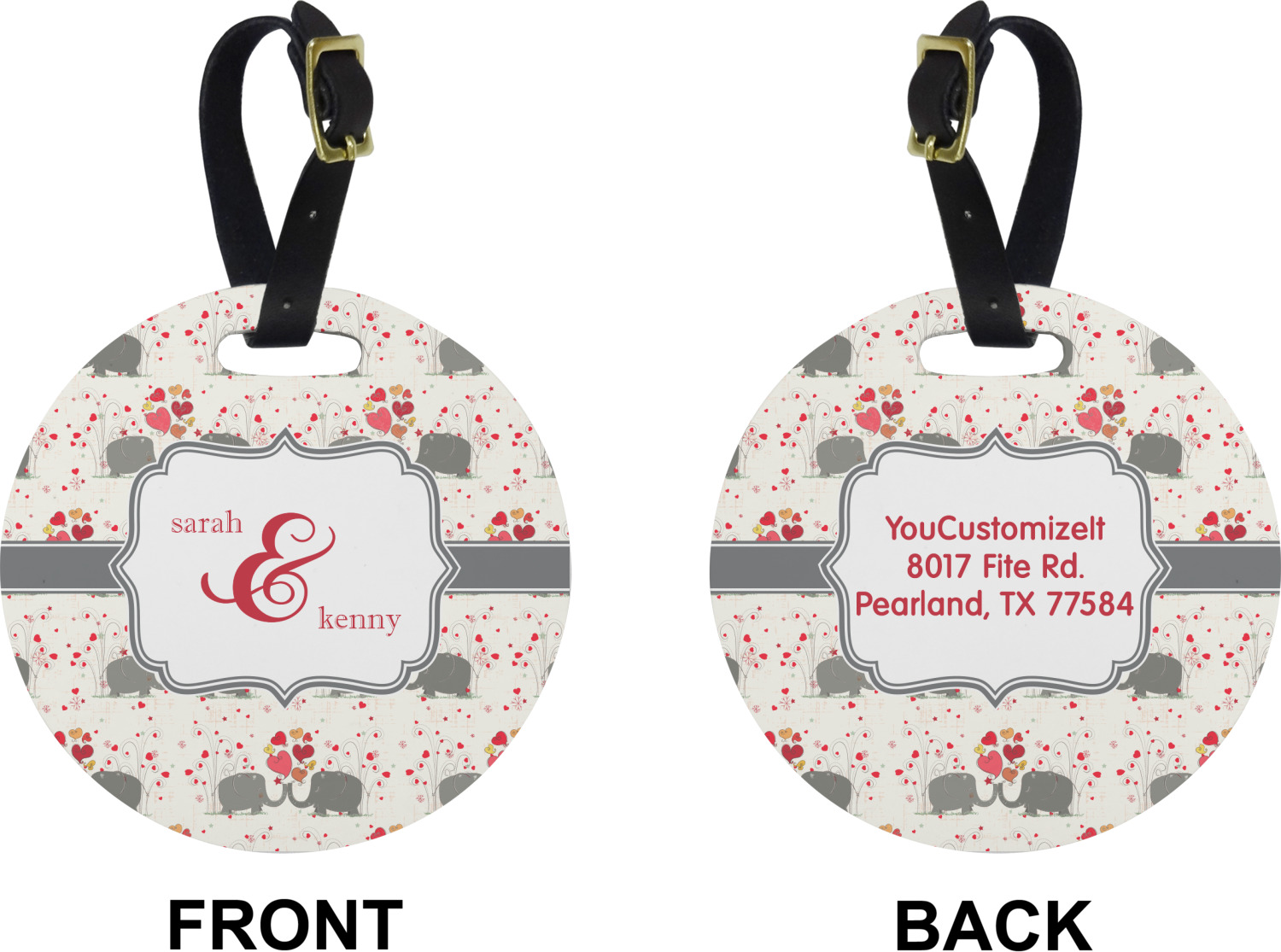 These personalized bag tags are sold in a variety of shapes, so that you may find the product that meets your vision exactly. We sell a round luggage tag, which measures at approximately 4" x 4". Our square luggage tag is about 3.5" x 3.5", while our rectangular version is 2.75" x 4 ".