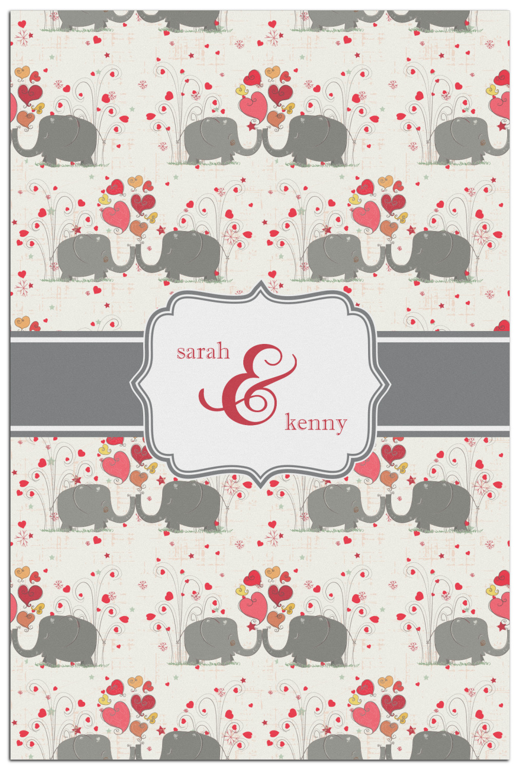 A demure gray ribbon matching the elephants' hides ties the whole design together. Add His&Her's names in the decorative label for that special touch.