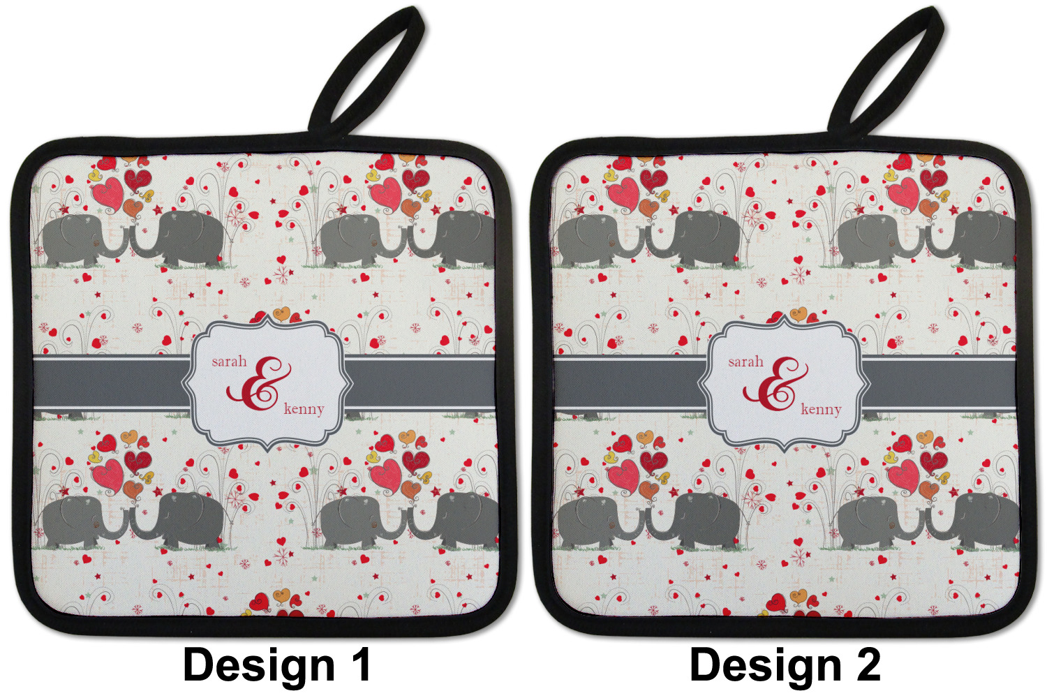 Our personalized pot holders feature a neoprene front that displays your personalization in vibrant colors. The backing of the hot pot holder is rubberized; the textured backing allows you to have a great grip when using this custom pot holder. The two materials are joined with a sleek, black trim, and the holder also includes an attached loop for hanging and storage. The pot holder is approximately 8.75 inches by 8.75 inches and 0.25 inches tall, while the fabric loop is 2.5 inches long. You can purchase a kitchen pot holder by itself or as a set of 2. We also offer a set including one pot holder and one oven mitt.
