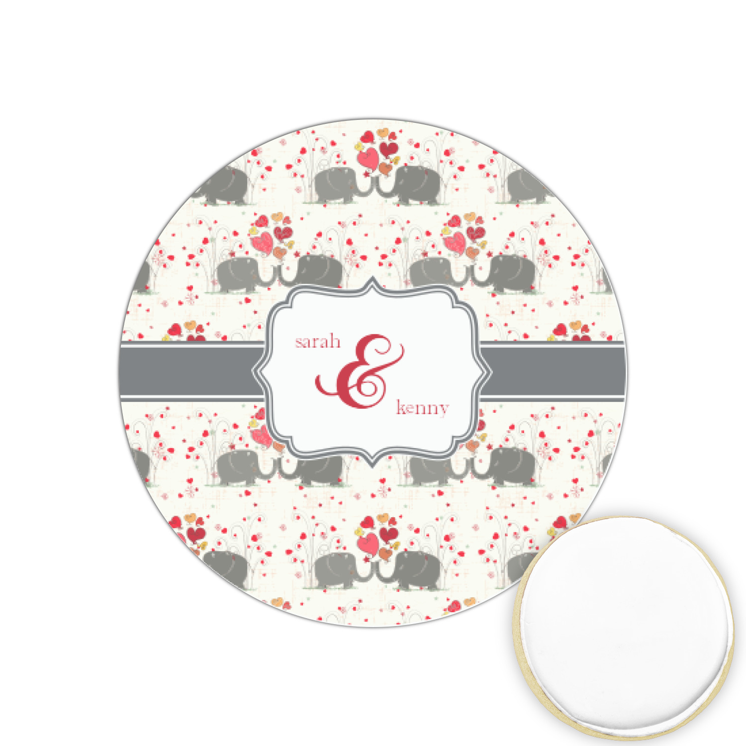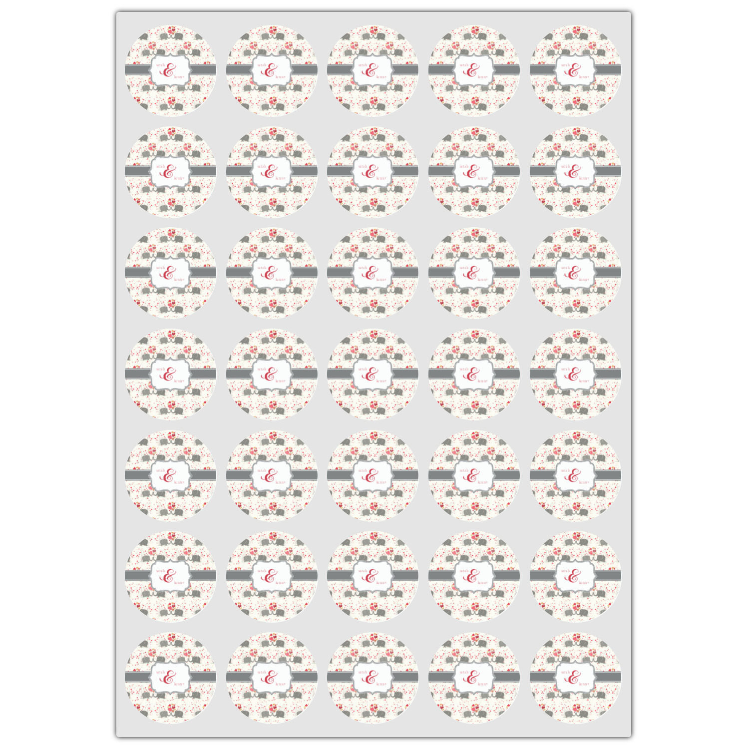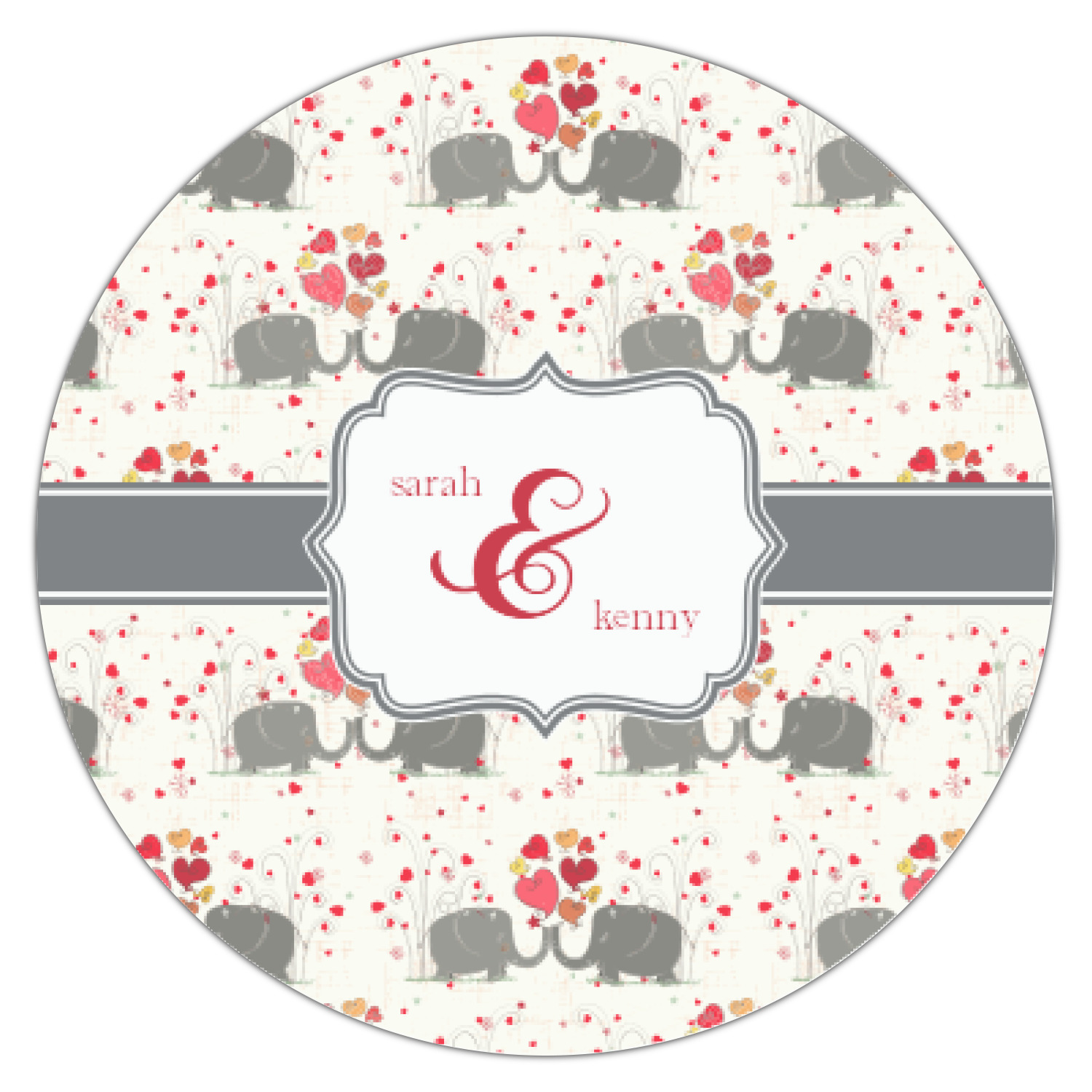 A demure gray ribbon matching the elephants' hides ties the whole design together. Add His&Her's names in the decorative label for that special touch.