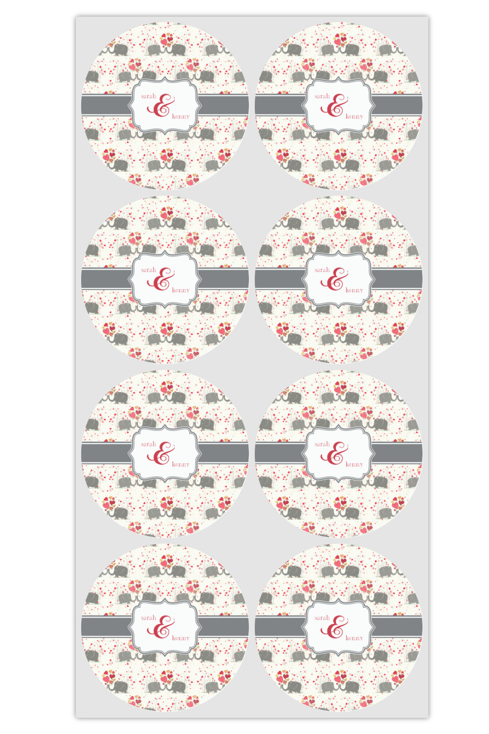 A demure gray ribbon matching the elephants' hides ties the whole design together. Add His&Her's names in the decorative label for that special touch.