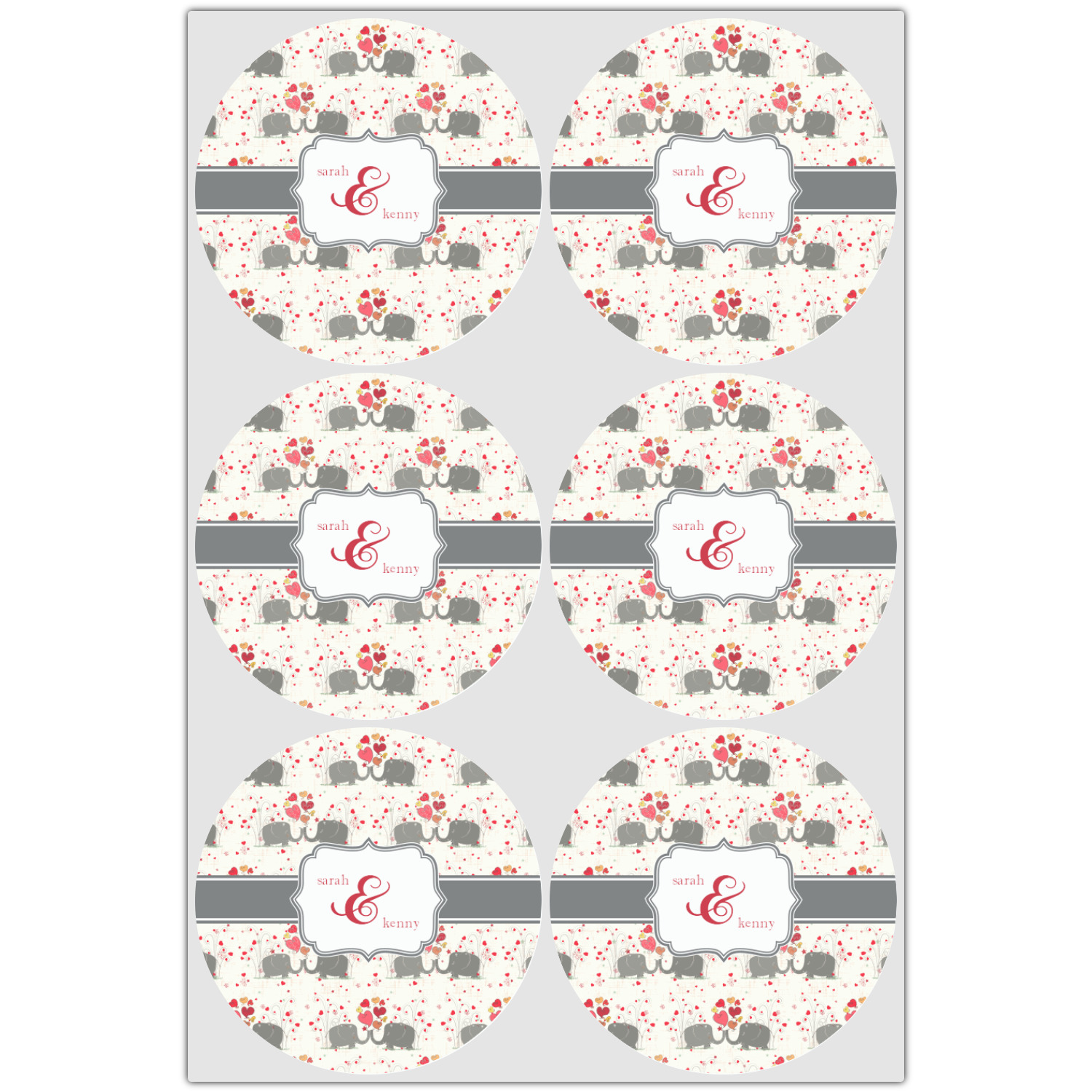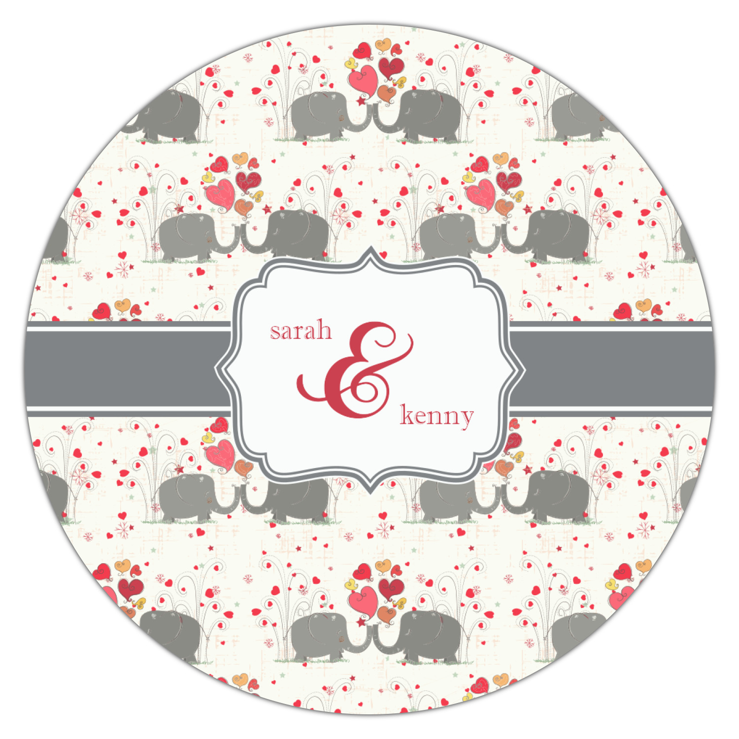 A demure gray ribbon matching the elephants' hides ties the whole design together. Add His&Her's names in the decorative label for that special touch.