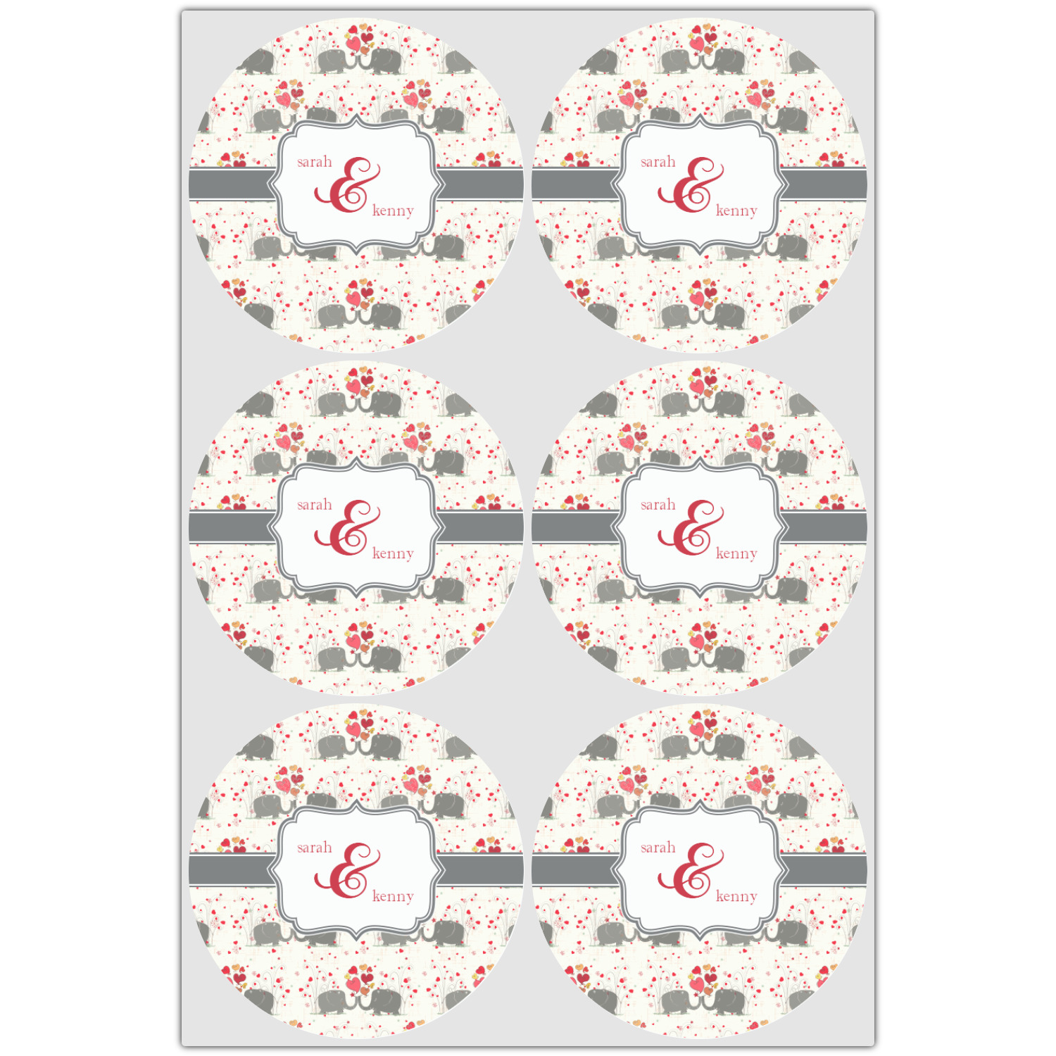 A demure gray ribbon matching the elephants' hides ties the whole design together. Add His&Her's names in the decorative label for that special touch.