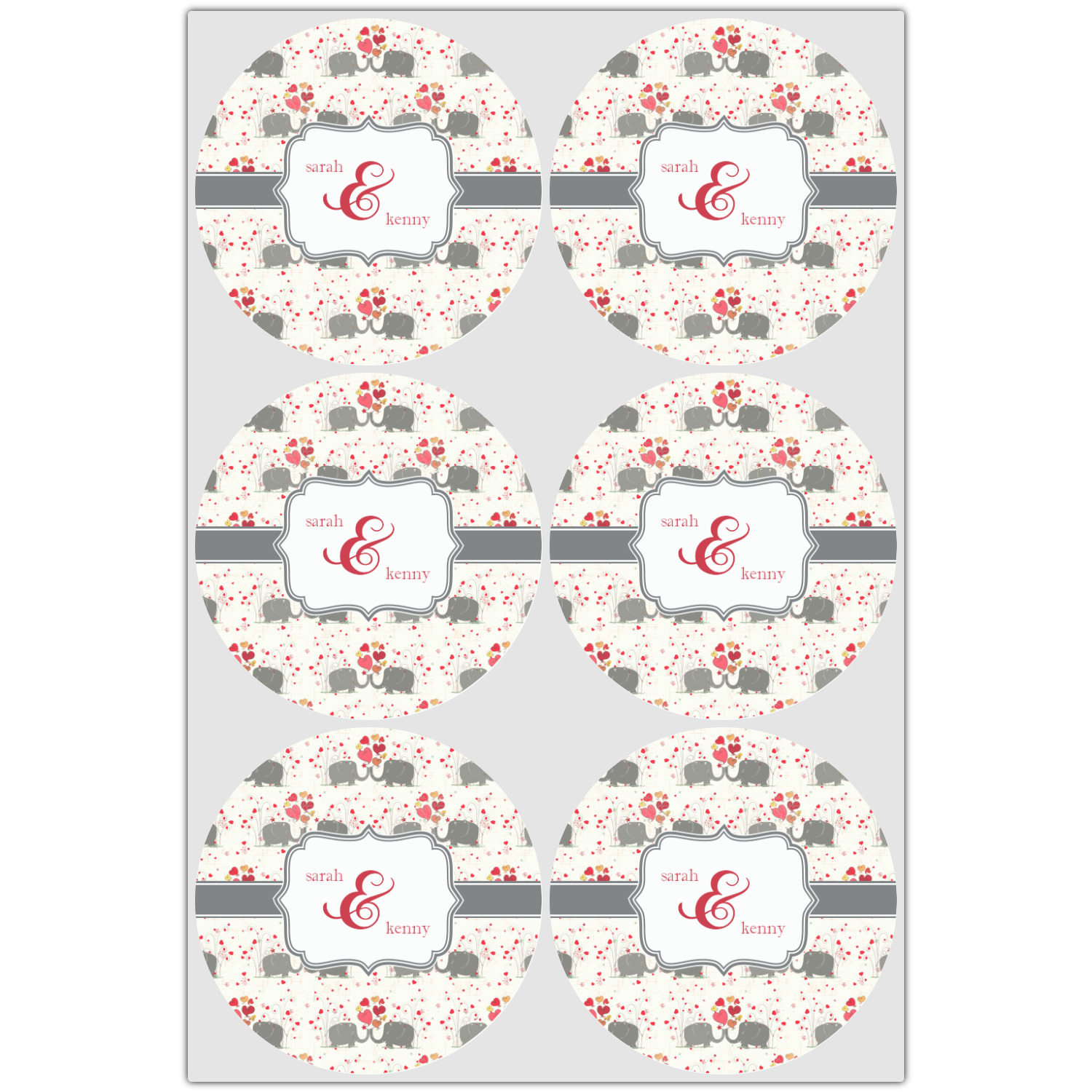 A demure gray ribbon matching the elephants' hides ties the whole design together. Add His&Her's names in the decorative label for that special touch.