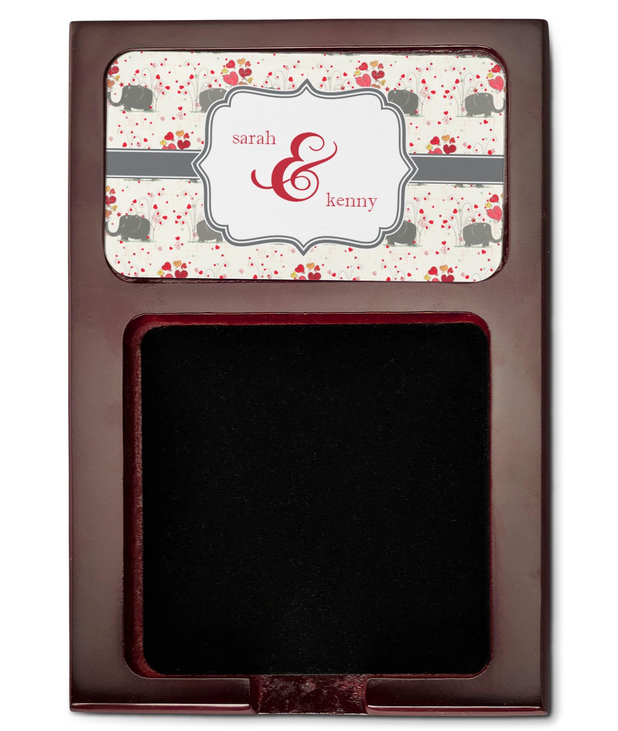 Crafted from a fine mahogany, this post it note holder is in the shade of a dark, cherry color. The dispenser itself is about 4.25 by 6.25 by 0.75 inches. You can place your 3 by 3 inch sticky notes in the indentation below the nameplate. We print your customization onto the nameplate that rests above the velvety indentation.
