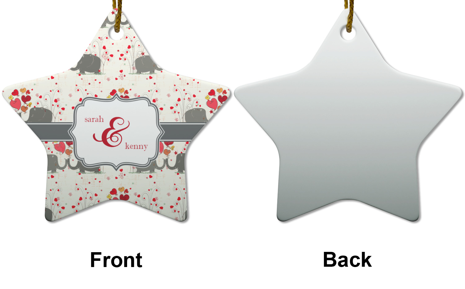 A demure gray ribbon matching the elephants' hides ties the whole design together. Add His&Her's names in the decorative label for that special touch.