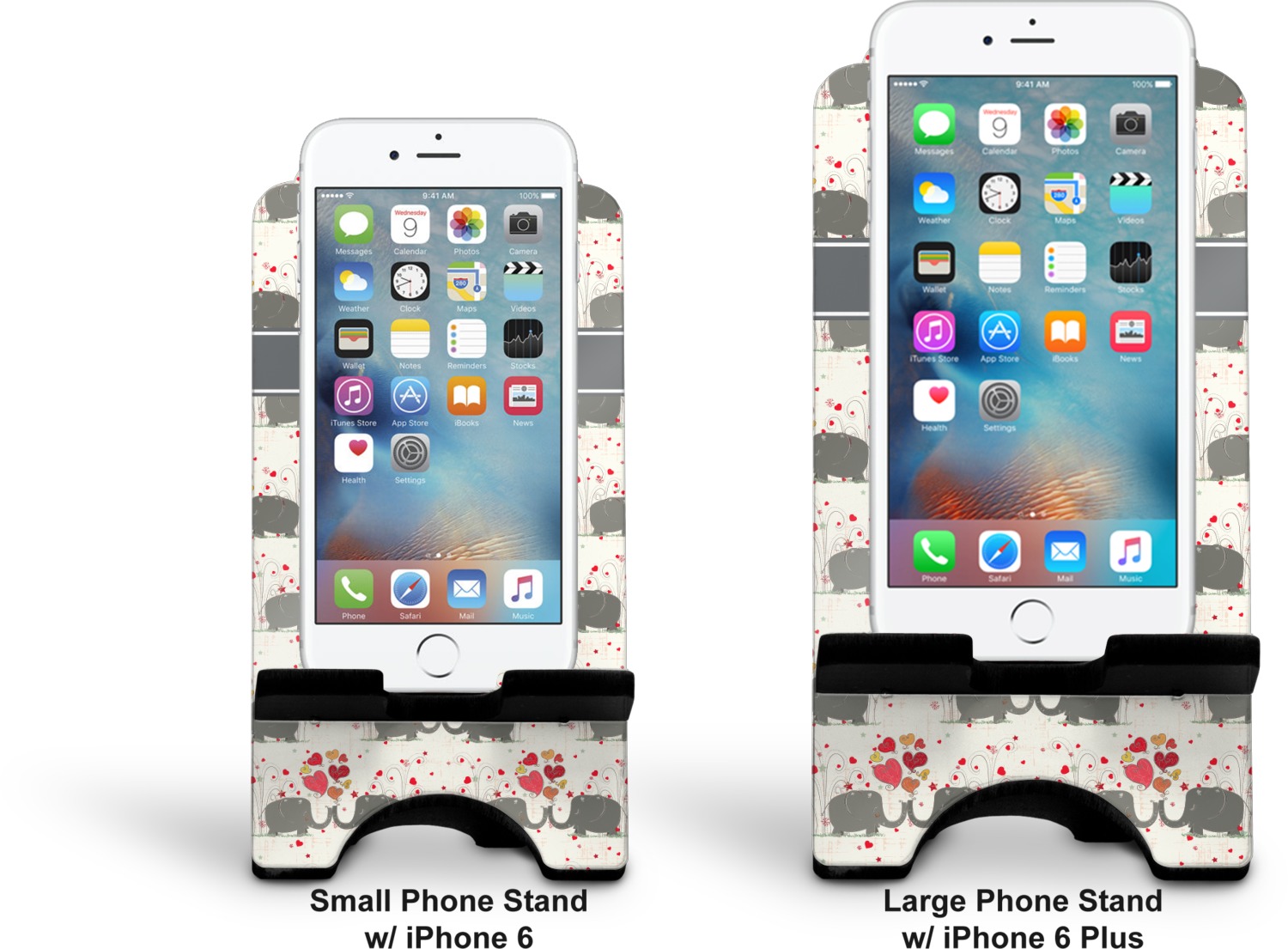 To meet your needs, we offer four variations of this IPhone stand. The backboard of the first version is shaped as a plain, yet sleek rectangle, and is available in two sizes. Our smaller size is approximately 4 by 3.25 by 7 inches, while the larger model is 4 by 3.77 by 8.5 inches. Alongside this model, we also provide you with a more decorative option. The upper part of our second version features a curved edge, for a classy, suave appearance. This phone holder is also sold in two sizes: a smaller version, which is 4 by 3.25 by 7 inches, and our larger model, which is 4 by 3.77 by 8.5 inches. Both models will support large phones, but the larger model is better if you wish to proudly display your personalized design.