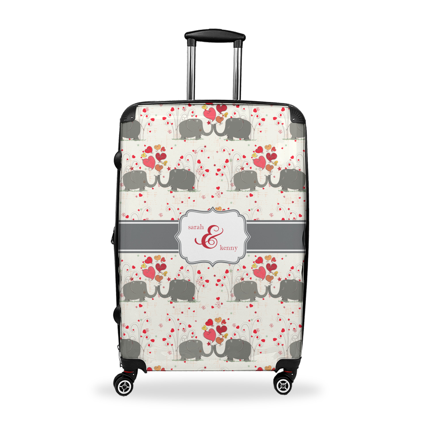 A demure gray ribbon matching the elephants' hides ties the whole design together. Add His&Her's names in the decorative label for that special touch.