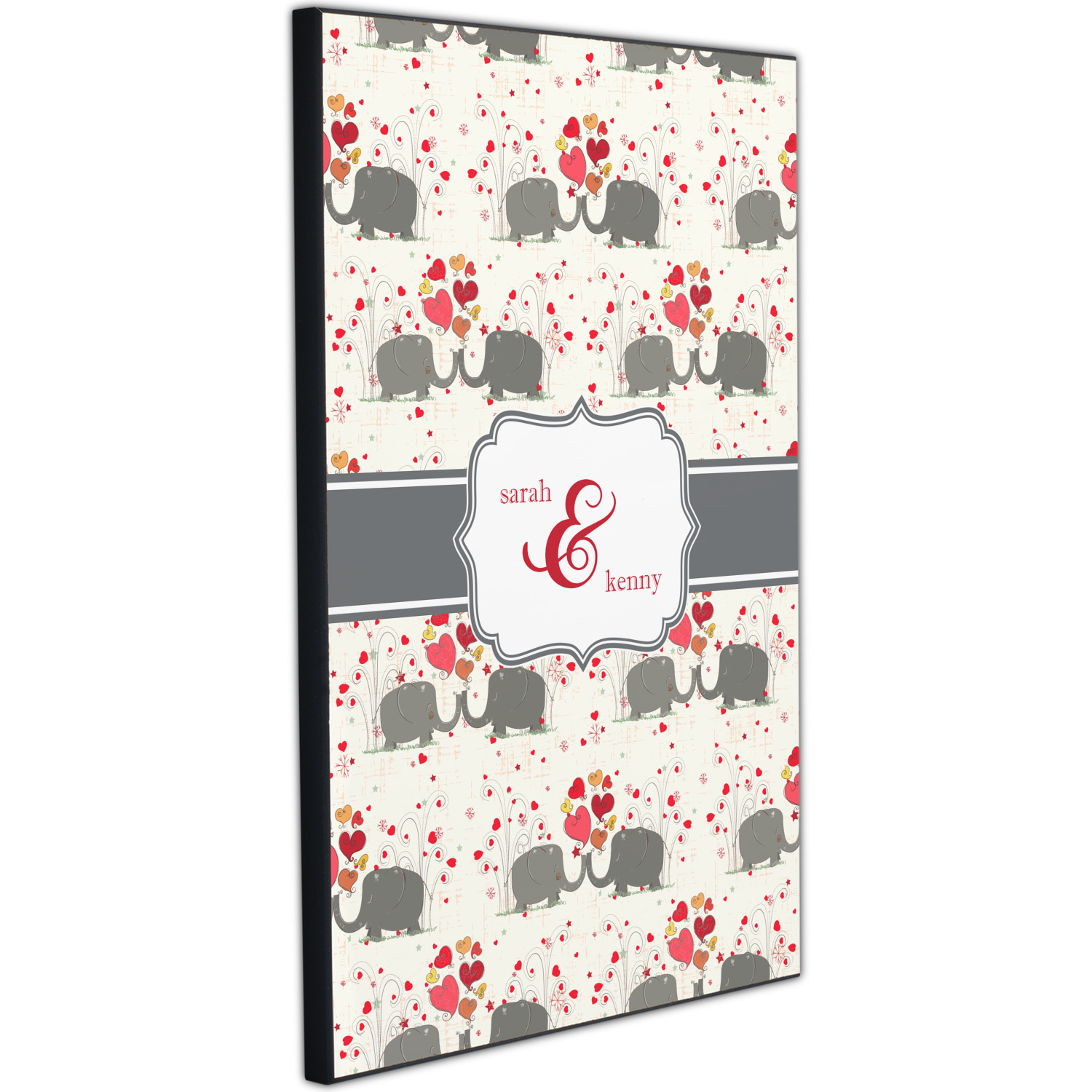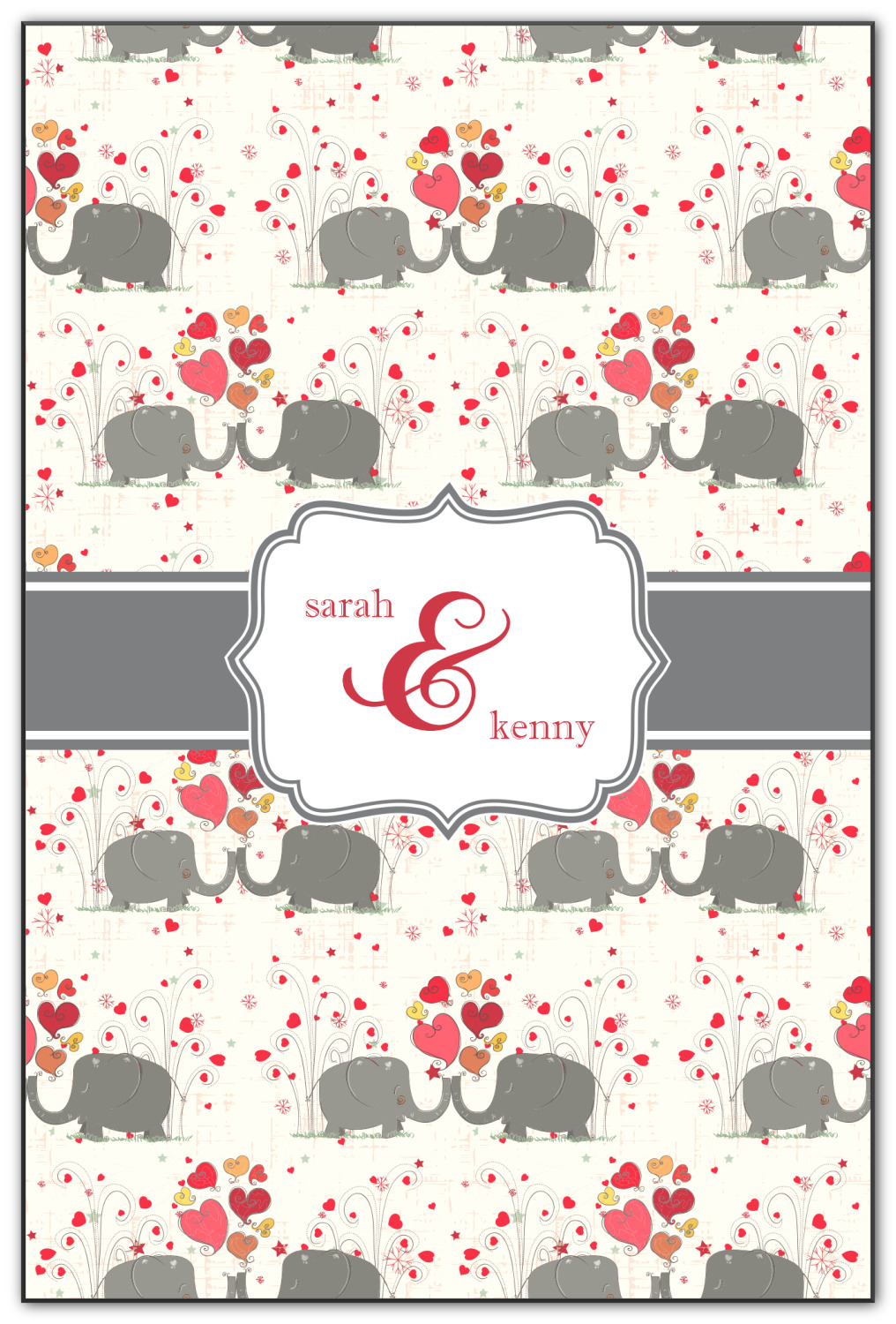 A demure gray ribbon matching the elephants' hides ties the whole design together. Add His&Her's names in the decorative label for that special touch.
