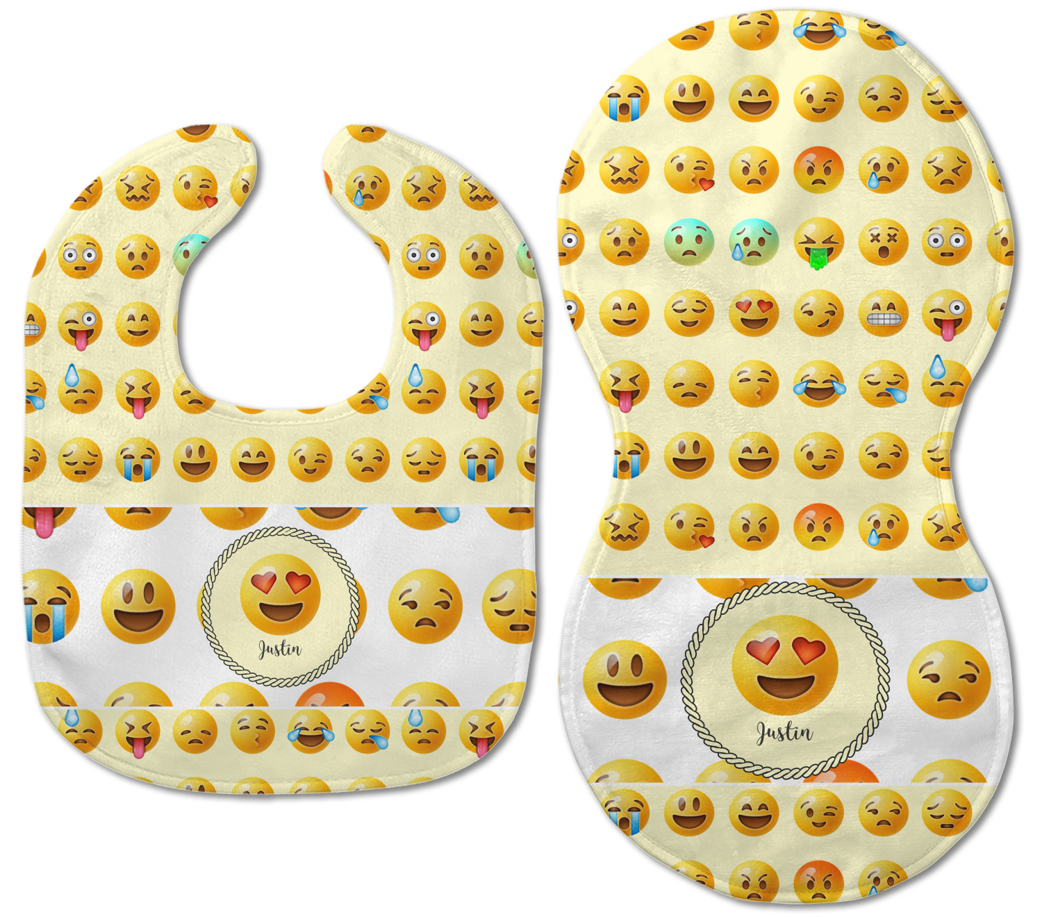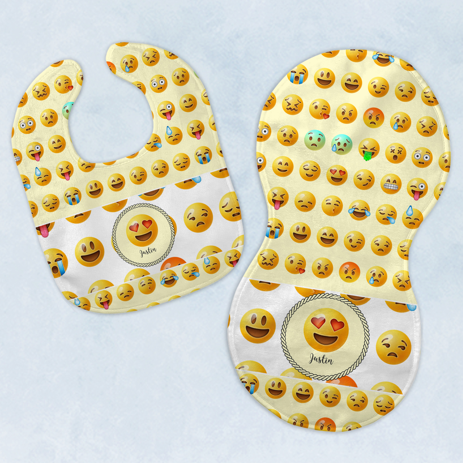 Both our baby bib and burp pad are made up of soft, microfiber velour with a cotton backing. The comfortable and plush material of our bib and burp set is perfect for both baby and parent. We print your design on the microfiber velour face fabric with baby safe ink on your customizable bib and burp cloth to ensure safety for the little one! Our drool bib also comes with a Velcro clasp for safe and easy wear while the burp cloth is a unique peanut shape that perfectly hugs over the shoulder.