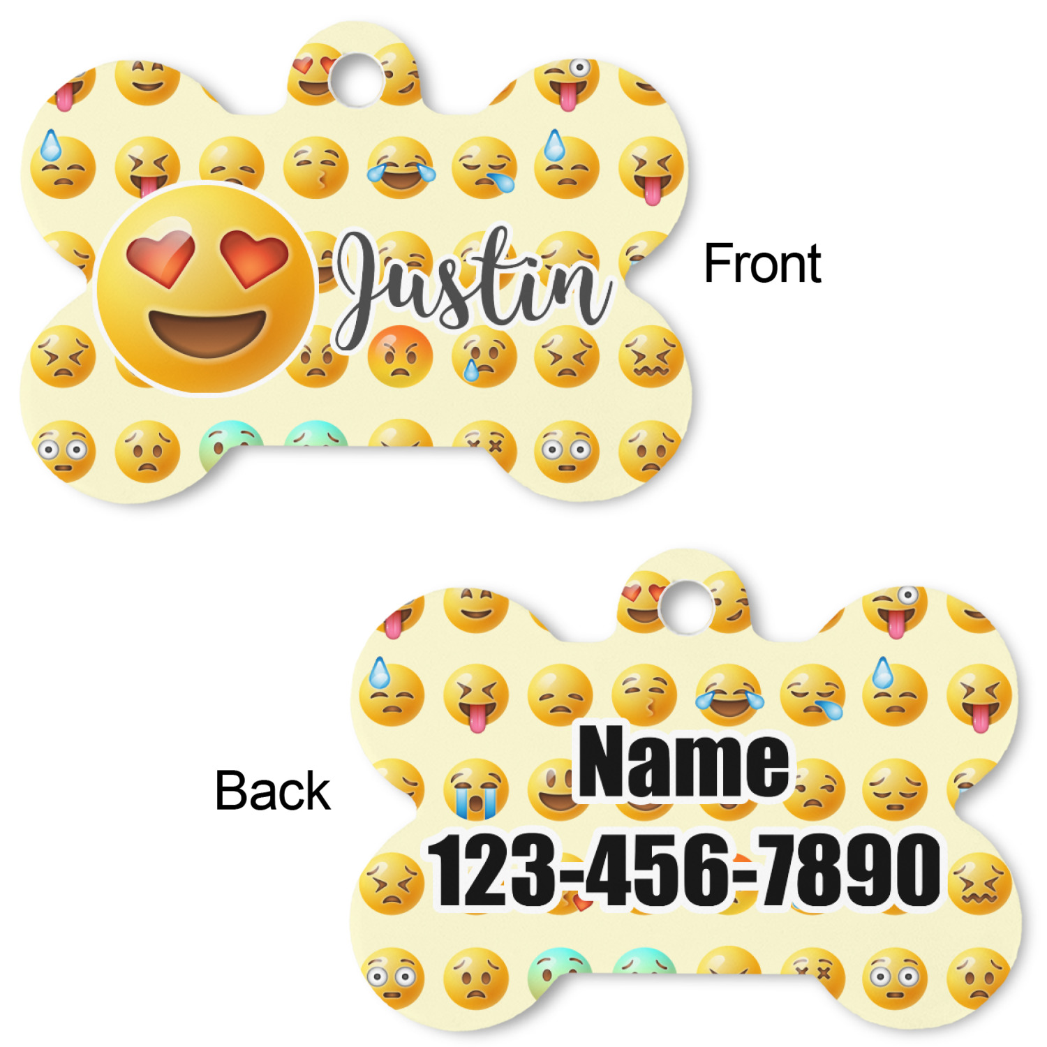 Our default design templates print your dog's personalization on the front and your contact information on the back; however everything is customizable, so you customize the patterns, the colors, the personalization, the contact information etc.