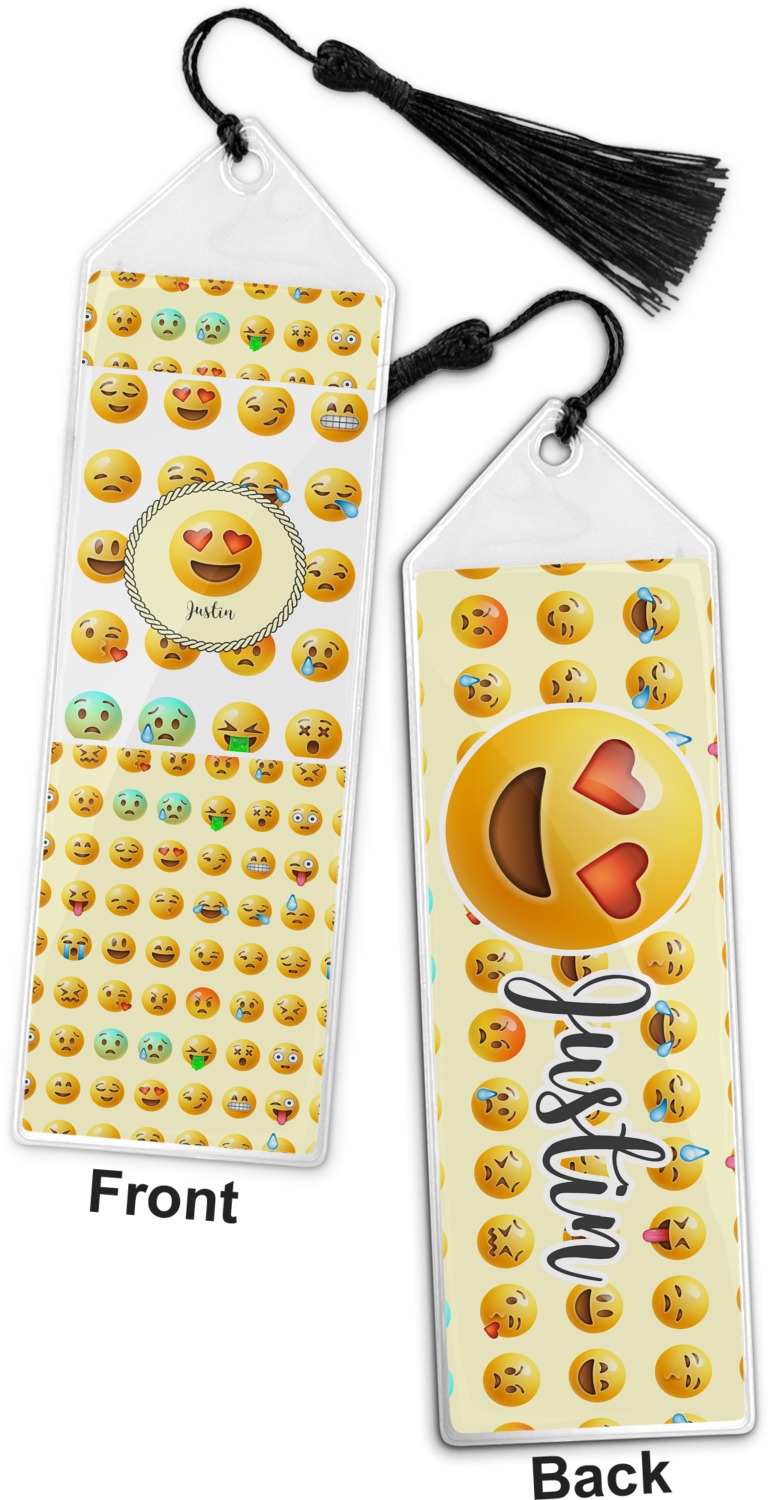 Your personalized bookmark is made of a sturdy, clear vinyl, and is approximately 7.5" x 2.25". We display your personalization on vinyl inserts that are placed on both sides. Accompanying each book marker is a black, fringe tassel that attaches to the reinforced, triangular header.