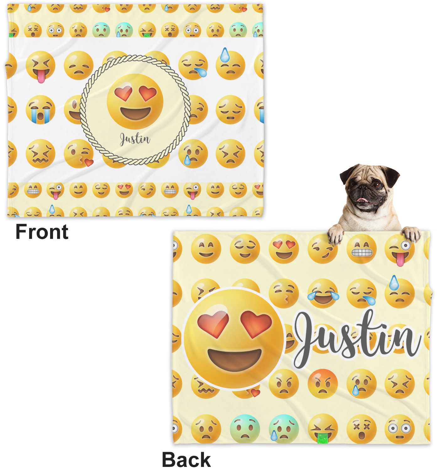 These dog blankets are crafted from a gentle, soft-to-the-touch, minky material. We print your customizations, either matching or differing, on both the top and underside of the blanket. These personalized dog blankets are available in two sizes: regular and large. Our regular size, at 40" x 30", accommodates small and some medium size dogs. At 60" x 50", our large dog blanket is a better fit for bigger breeds. Though specialized for dogs, these blankets still make a thoughtful gift for your favorite feline, or any other pet in mind!