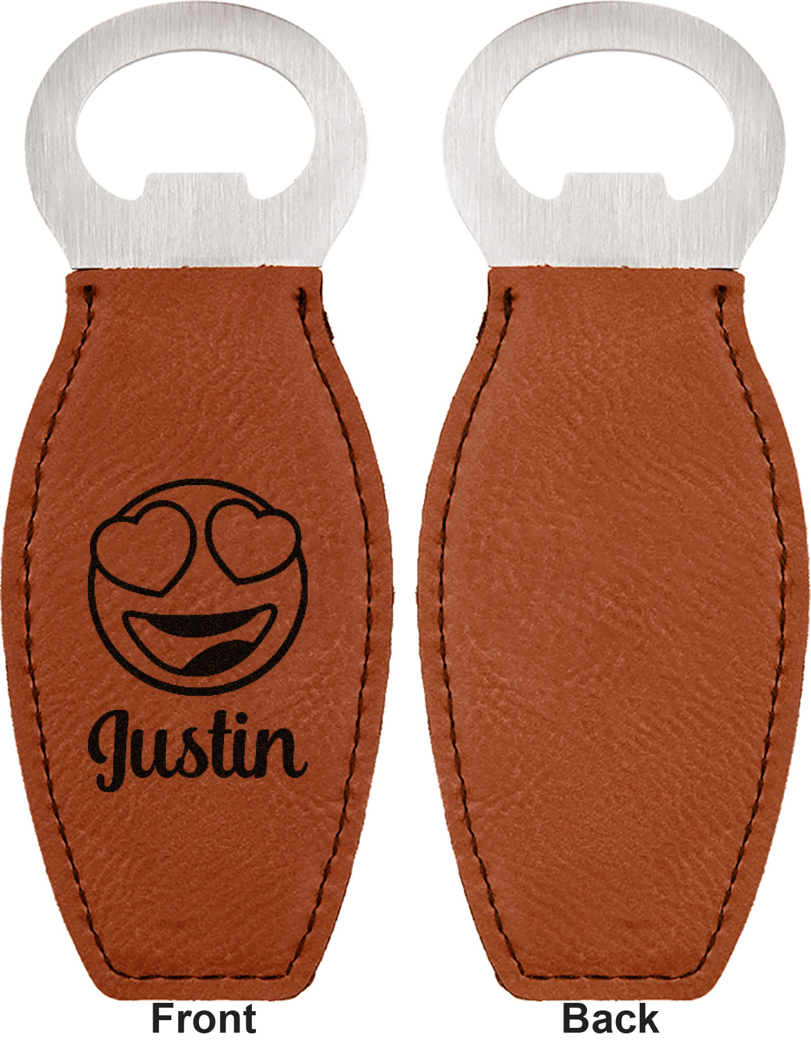 Built from stainless steel, these custom bottle openers are wrapped in a cognac-colored leatherette. Sharp, black stitching lines the edges for extra durability and a finished touch. Your personalization is laser-engraved onto the surface of this leatherette, leaving behind a crisp, black coloration. At 4.6 by 1.8 inches, this beer bottle opener gives you much of leverage when trying to open a stubborn bottle. On the opposite end of the opener, you'll find a magnet that you can use to display your new, unique bottle opener!