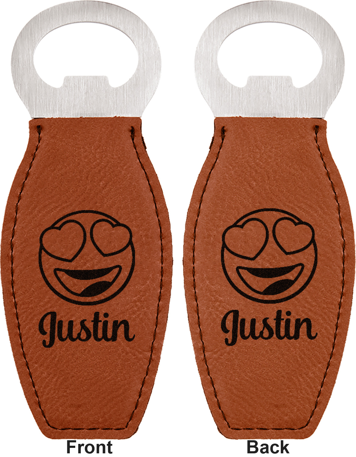 Built from stainless steel, these custom bottle openers are wrapped in a cognac-colored leatherette. Sharp, black stitching lines the edges for extra durability and a finished touch. Your personalization is laser-engraved onto the surface of this leatherette, leaving behind a crisp, black coloration. At 4.6 by 1.8 inches, this beer bottle opener gives you much of leverage when trying to open a stubborn bottle. On the opposite end of the opener, you'll find a magnet that you can use to display your new, unique bottle opener!