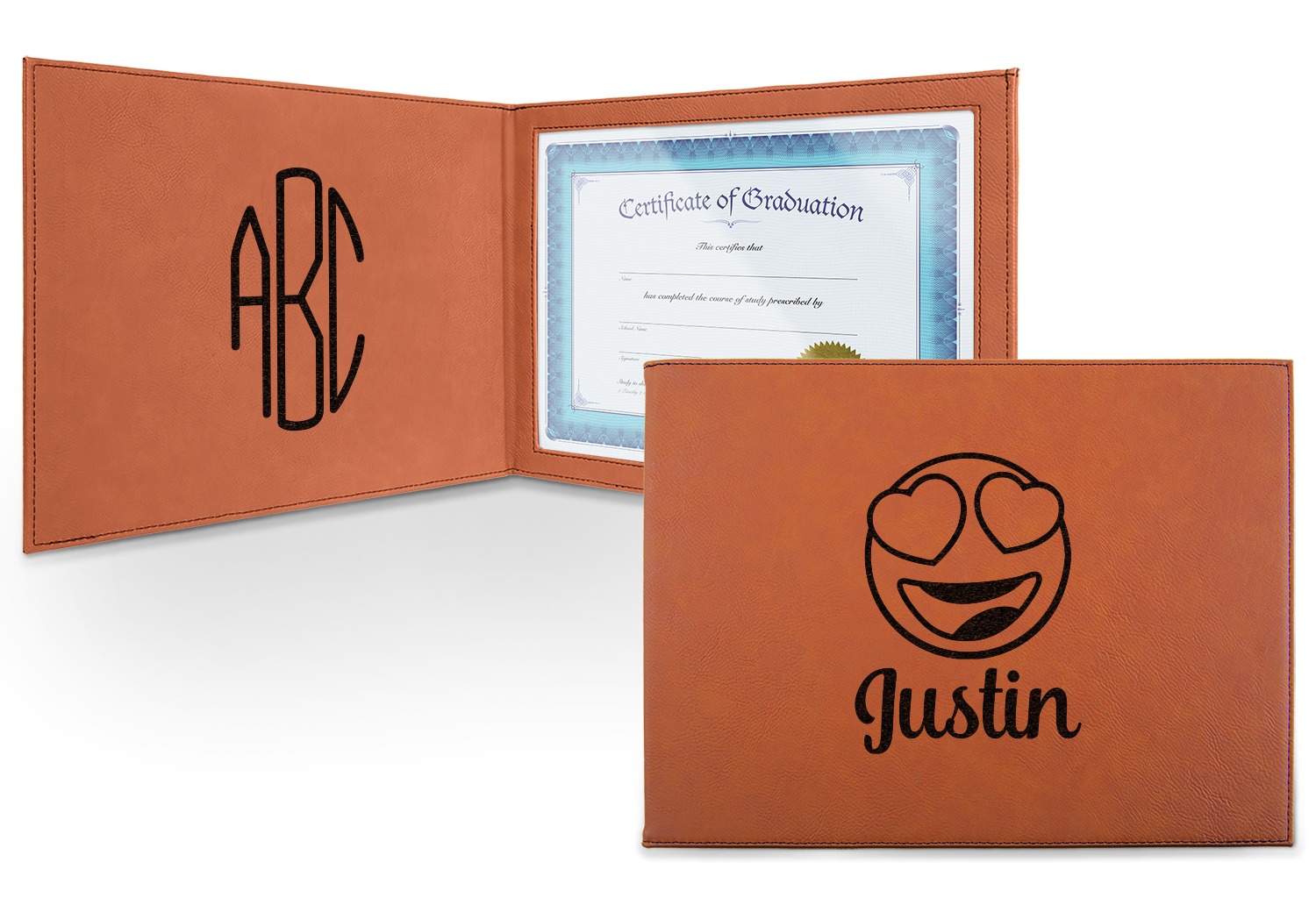 This cognac-colored, leatherette certificate jacket is the ideal way to display or store your hard-earned certificate. When closed, the custom certificate holder measures at 12 by 9 inches. The interior of the certificate cover includes a clear, vinyl window to encase your diploma. The window measures at around 10.5 by 7.5 inches and can accommodate a diploma that measures at up to 8.5 by 11 inches. You can either choose to have your customization laser engraved on the front and interior, or solely the front.