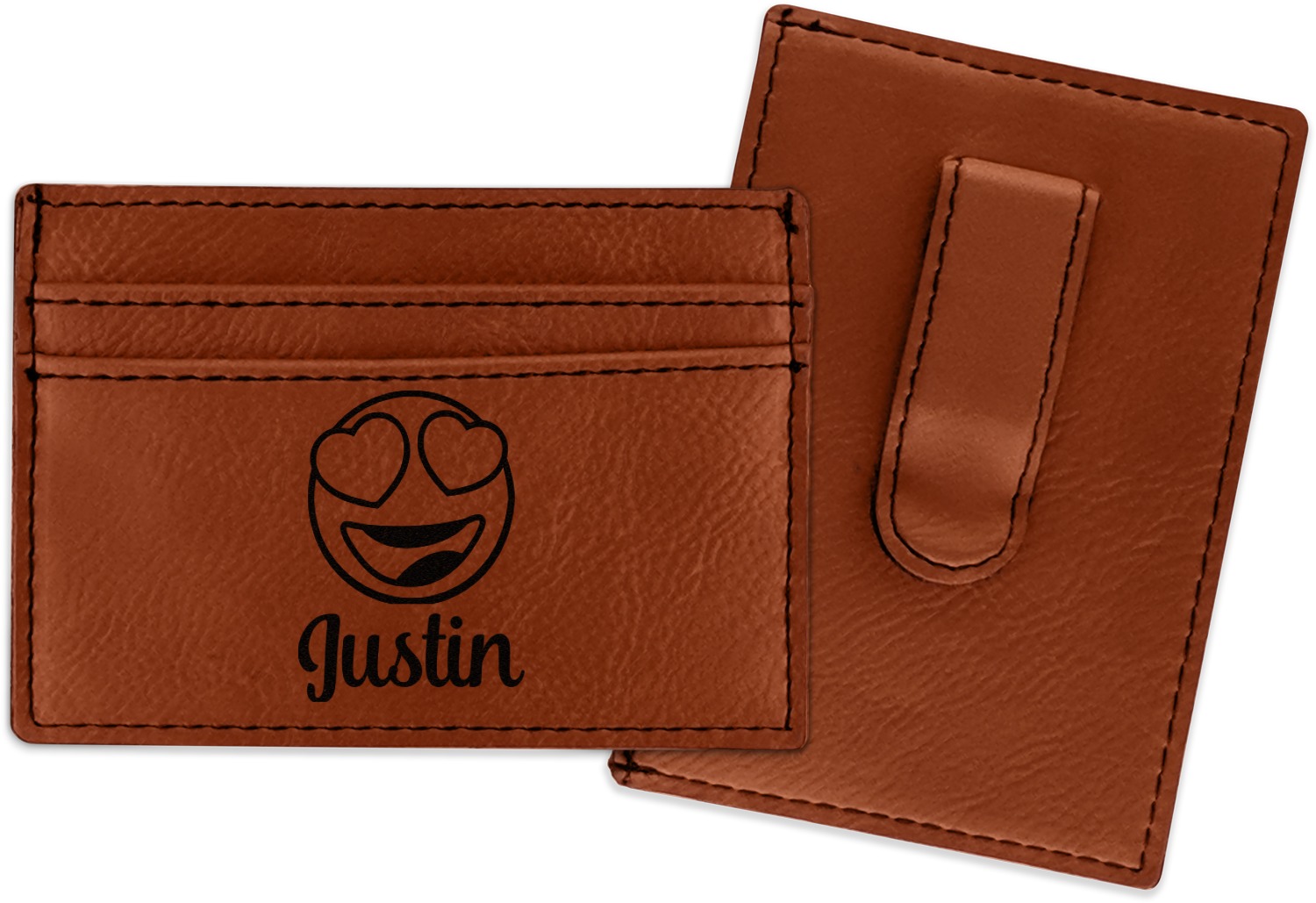 Made from a smooth brown leatherette material, these money clip wallets are the perfect accessory. They measure at approximately 4" x 2.75". On one side there is a money clip where you can slip in your cash. On the other side are three card slots for an ID and credit card or two. The money clip wallet will be laser engraved with your design on the side with the credit card slots. The graphic will come out as a black color.