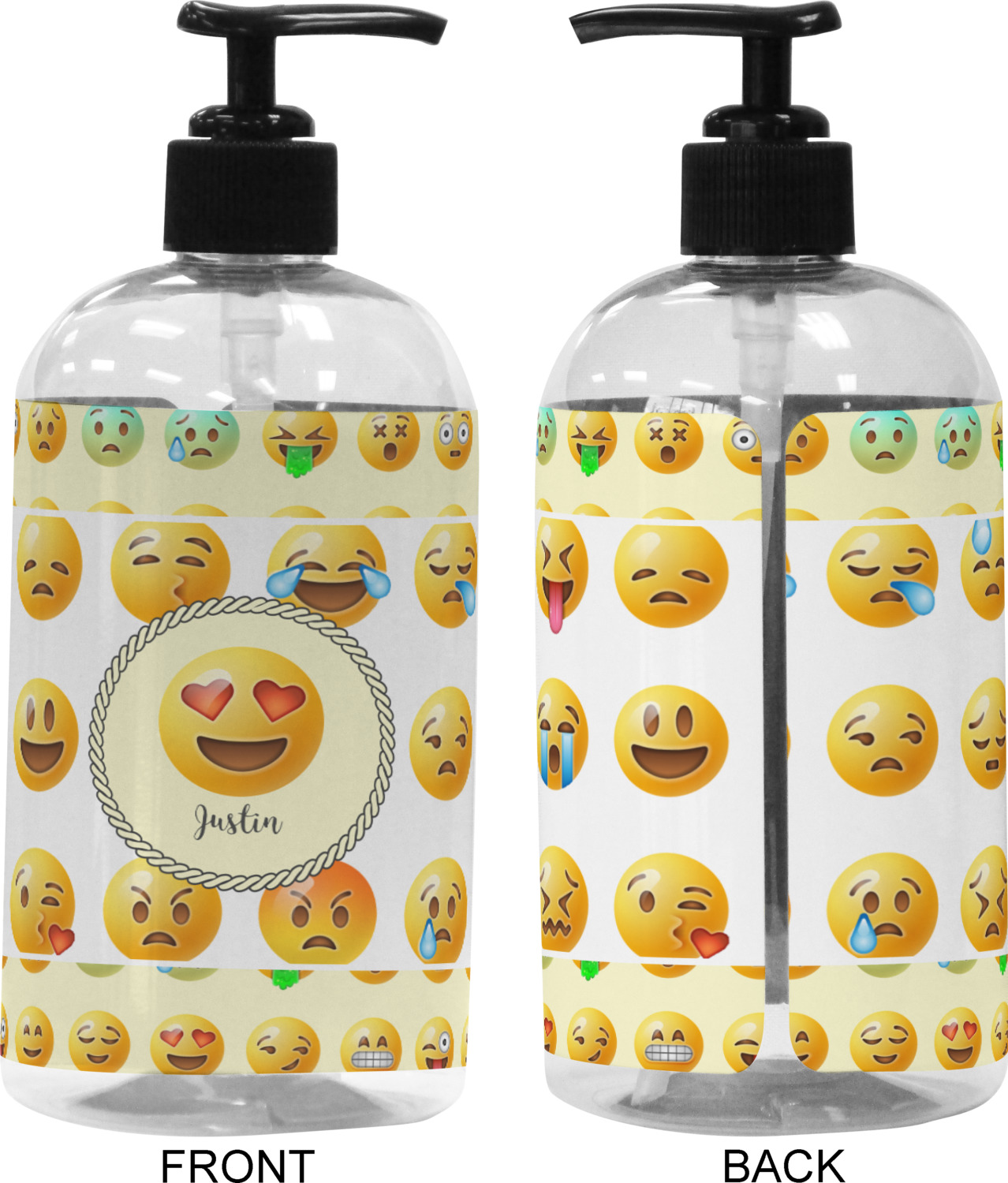 Who does not LOVE emojis? This design uses two different densities of our 3D Emoji background. We used the denser pattern on the top and bottom AND we used a light yellow for our background color. In the middle, we changed the density and made the background color white. We then chose a simple round label and a graphic & text personalization style. We chose on of the emoji's for our graphic and a name for our text.